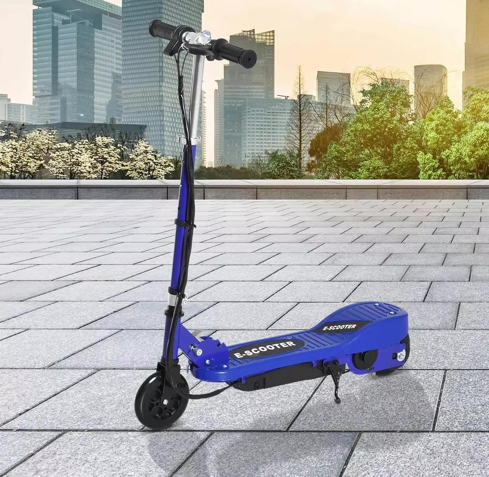 This electric scooter features a durable steel frame and polypropylene components, designed for longevity and stability. It is foldable for easy storage and transport and includes a retractable kickstand for balance when not in use. The handlebar height is adjustable to accommodate growing children.