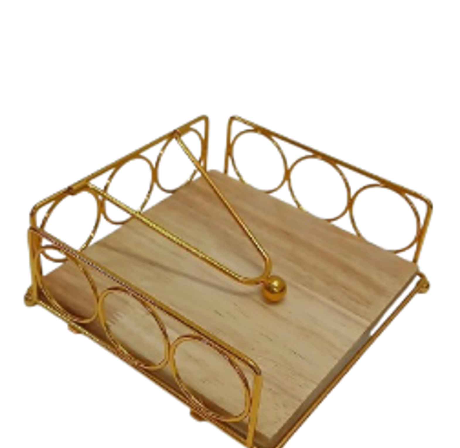 This is an elegant and modern napkin holder designed for holding cloth or paper napkins. It features a gold-colored metal frame with a distinctive circular pattern along the edges and a solid wooden base. A weighted arm, also gold-colored, pivots to secure the napkins in place.