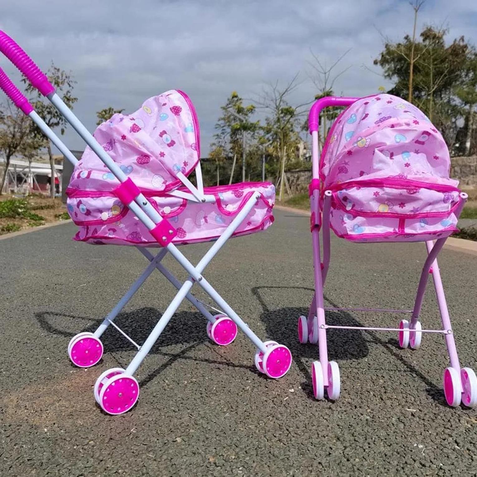 These are miniature, lightweight strollers designed for pretend play, encouraging children to express affection and care. The units in the image feature a bright pink color with small, colorful patterns on the fabric. They have a white or light pink frame and bright pink wheels. The unit on the left appears to be a pram style, while the one on the right is a more upright stroller style.