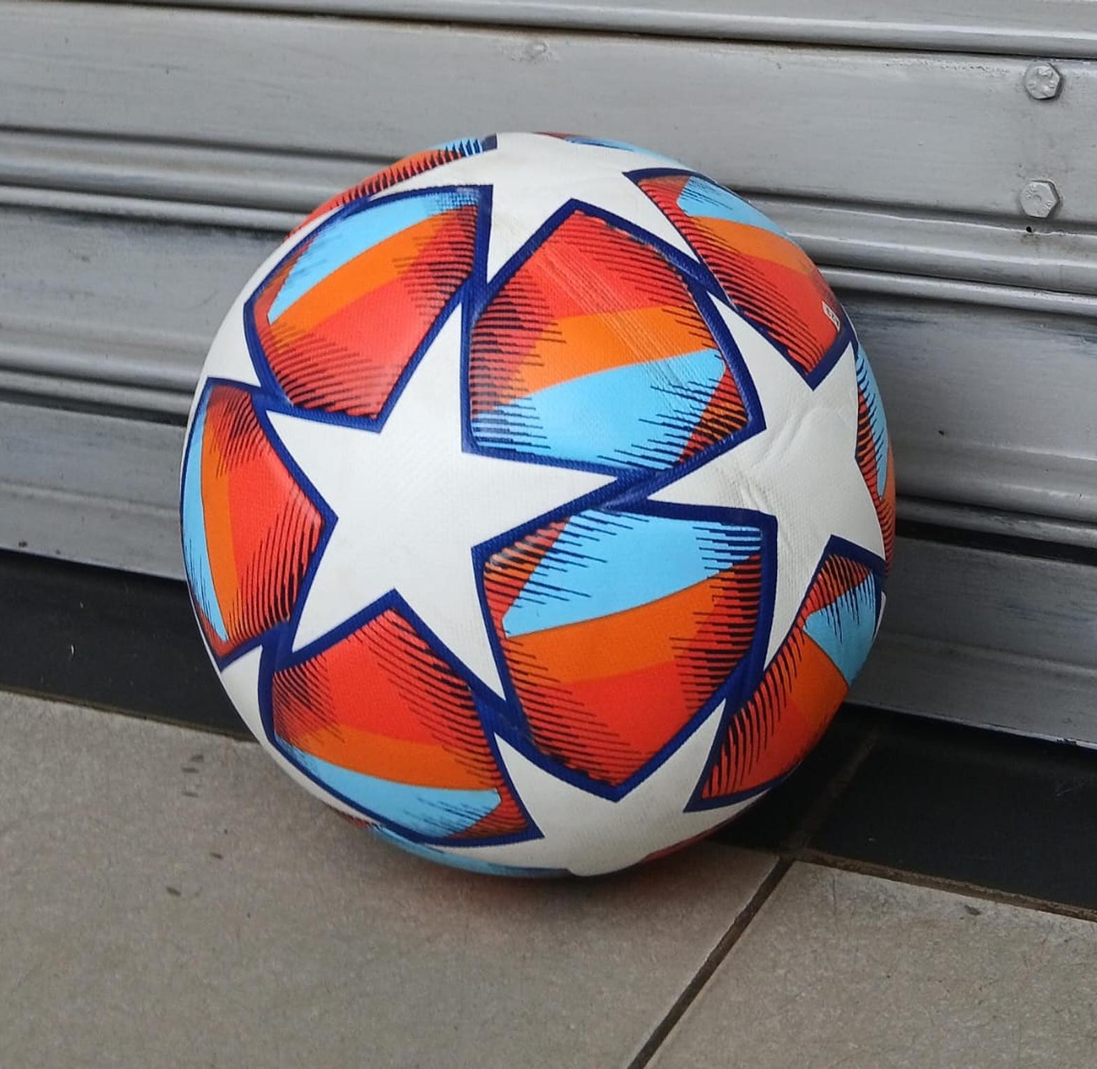 The soccer ball is the Adidas UCL Finale 20 Pro Official Match Ball. It was the official match ball for the UEFA Champions League during the 2020-21 season. The ball's design features a dynamic look with star panels in white, royal blue, and signal coral, which are framed in blue to create the illusion of movement when the ball is in flight.
