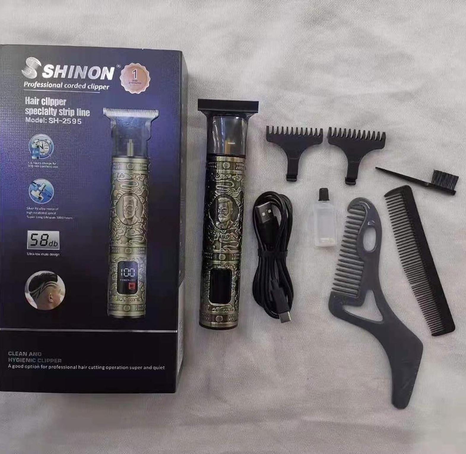 The hair clipper's name is SHINON Professional Corded Clipper, model SH-2595. It is designed for professional hair cutting, with a low noise operation of 58dB. The clipper includes various attachments, such as guide combs, a cleaning brush, and a USB charging cable. It has a digital display and stainless steel blades.