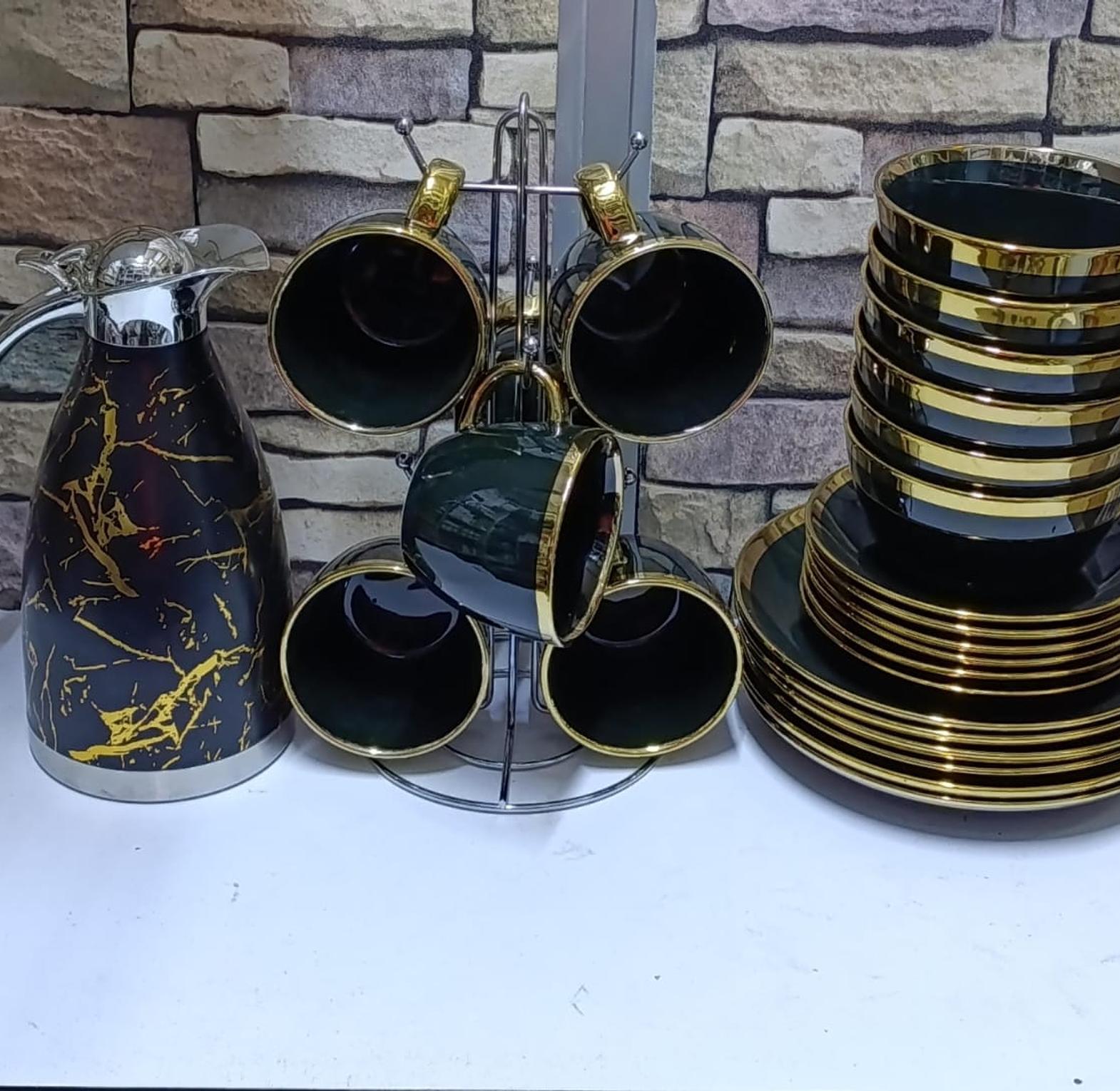 A set consist of: 6pcs Dinner mugs, 6pcs Dinner side plates, 6pcs dinner bowls 6pcs dinner plates 2Lts flask