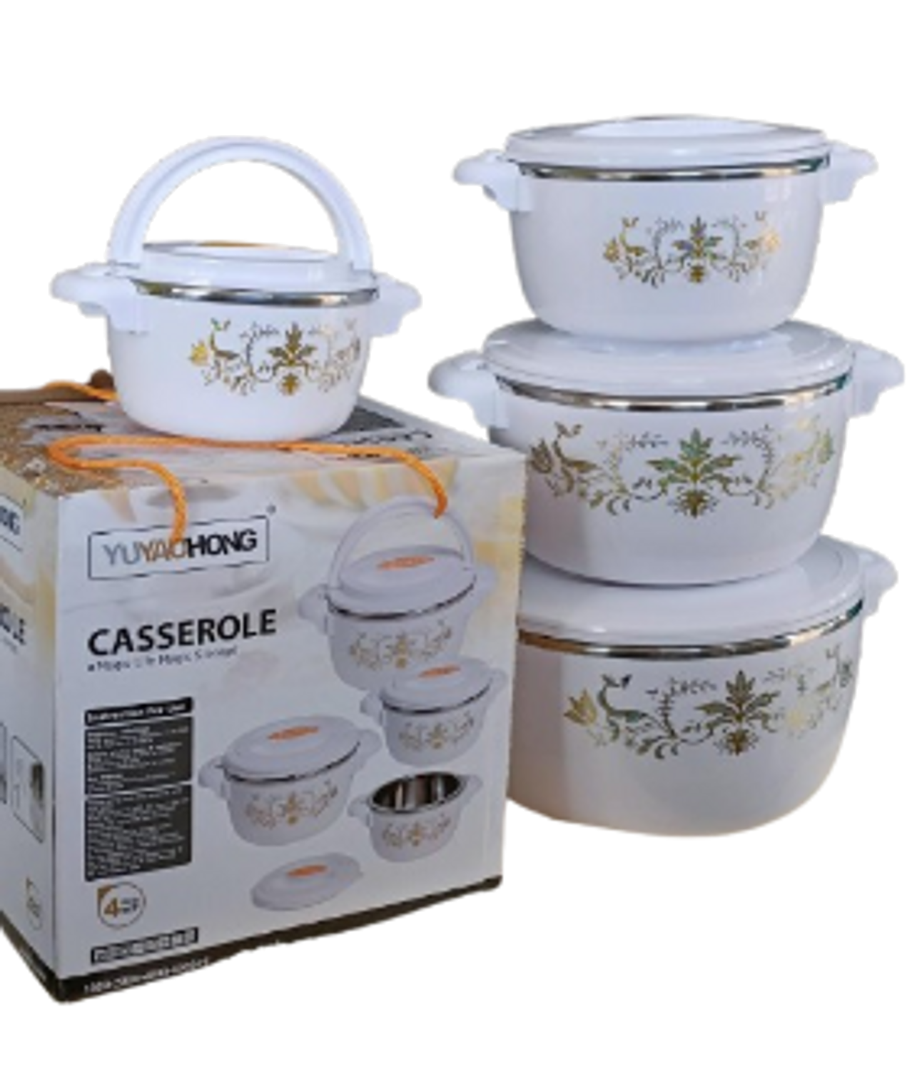 Have your self these elegant and classic large 4 pieces hot pots at home. This casseroles are odorless, durable, and virtually unbreakable. These hot pots have a fusion of stainless steel and plastic , they come with a high grade stainless steel interior which makes it easy to clean. They also keep your food hot or warm from 4 to 6 hours a day. The patented locking lid of these pots keeps food fresh and spill proof - great for transporting food to parties, picnics, and potlucks.
