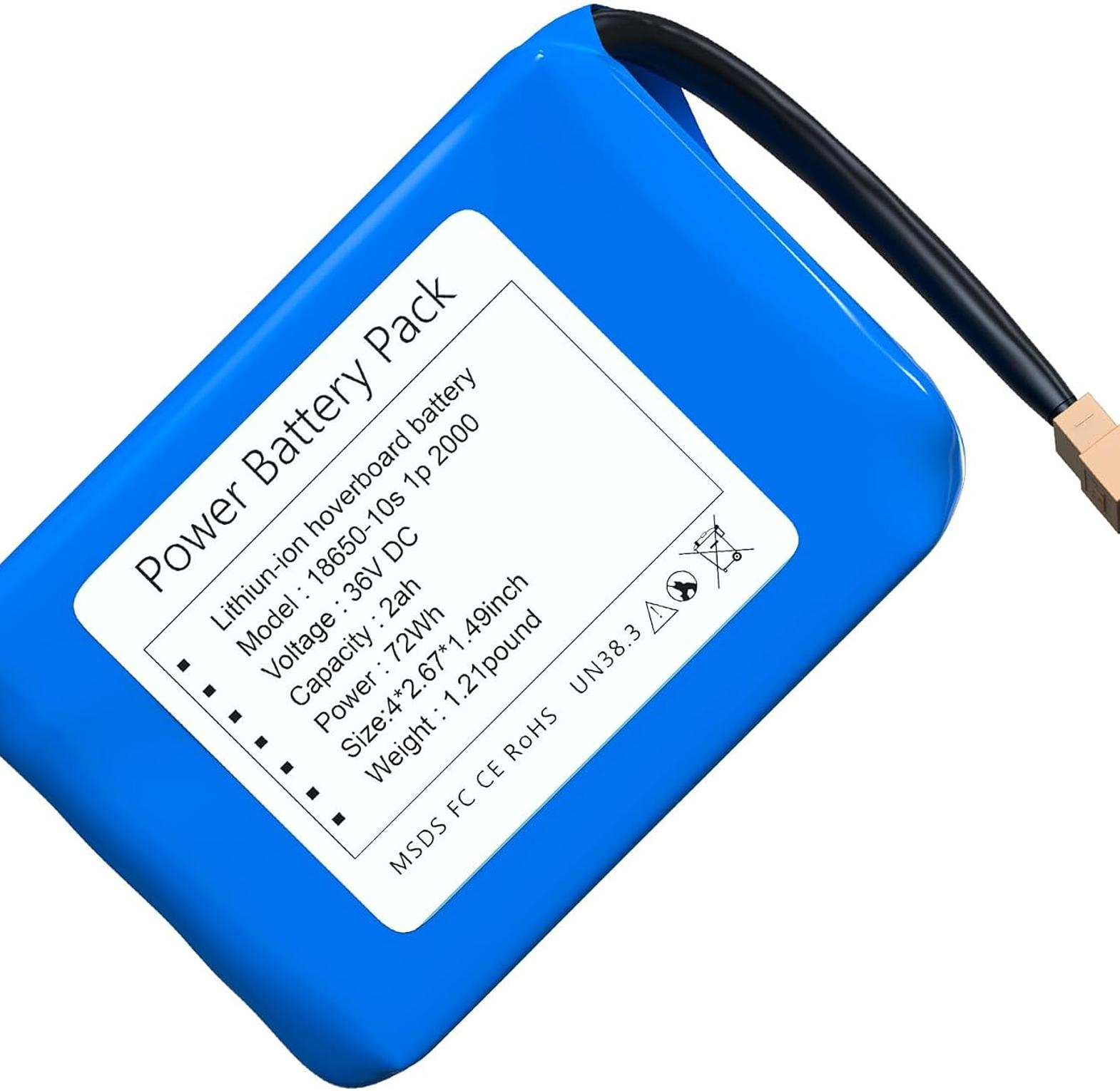 This is a 36V 2Ah lithium-ion battery pack designed as a replacement for hoverboards. It has a capacity of 2 amp-hours (Ah), a voltage of 36 volts, and provides 72 watt-hours (Wh) of power