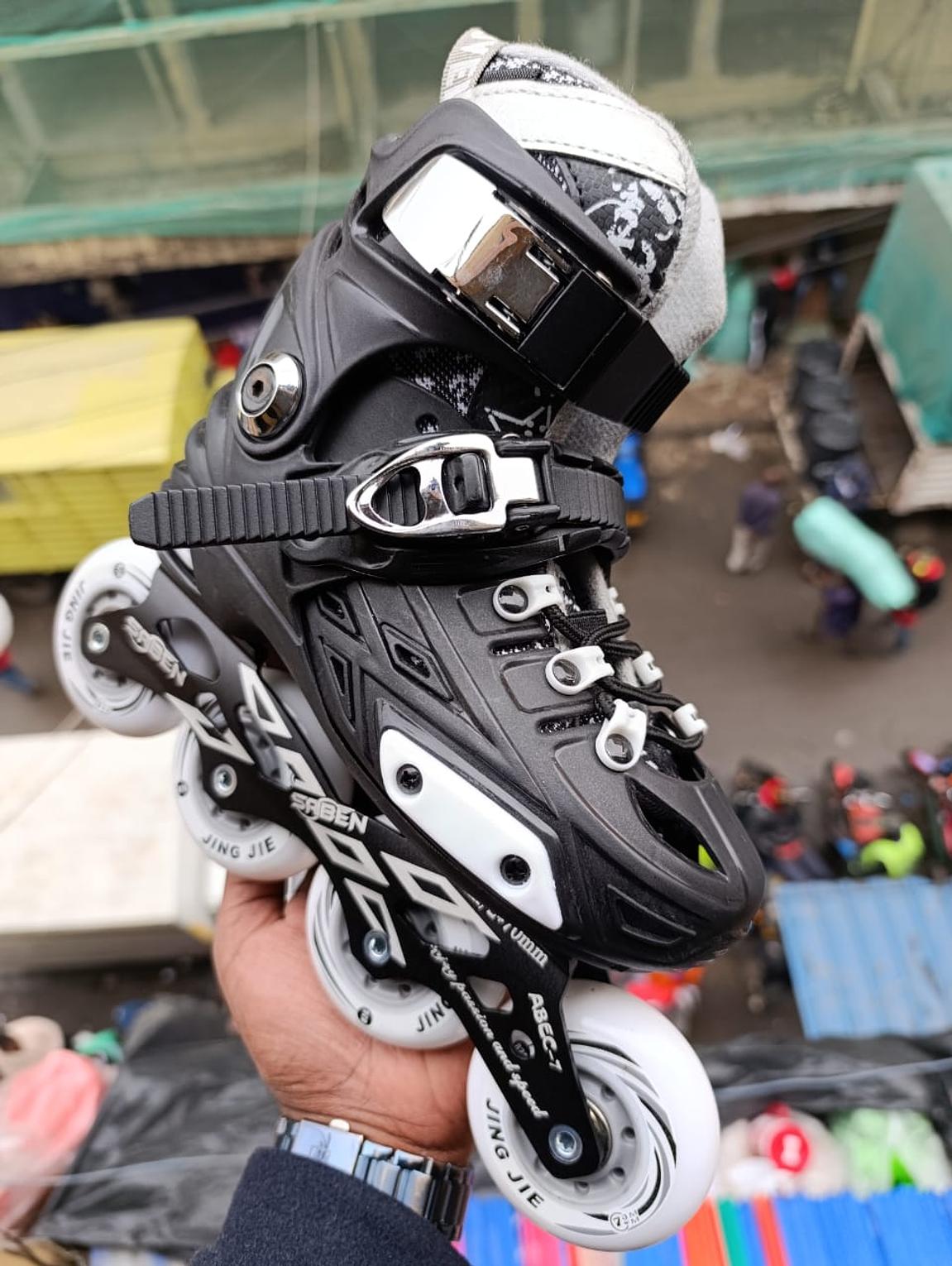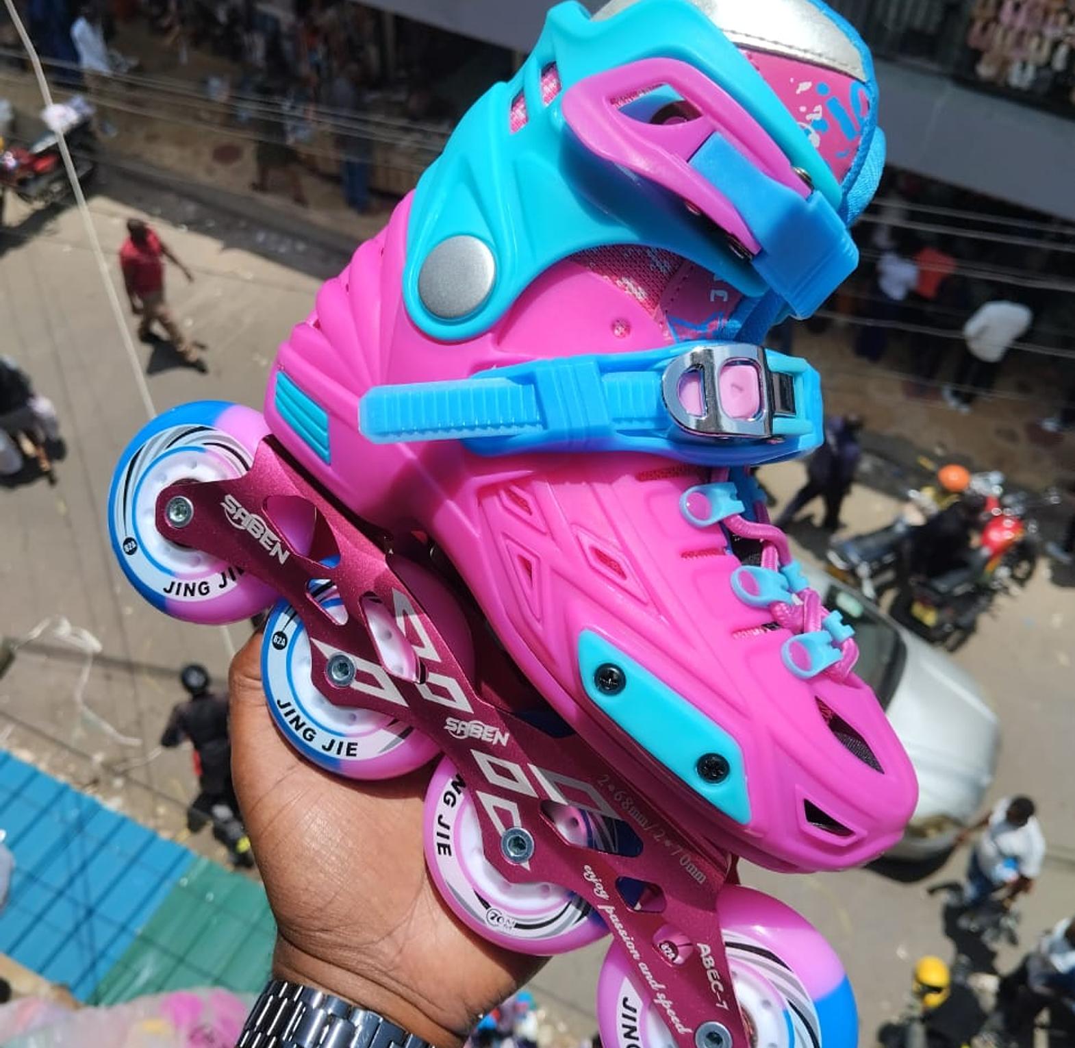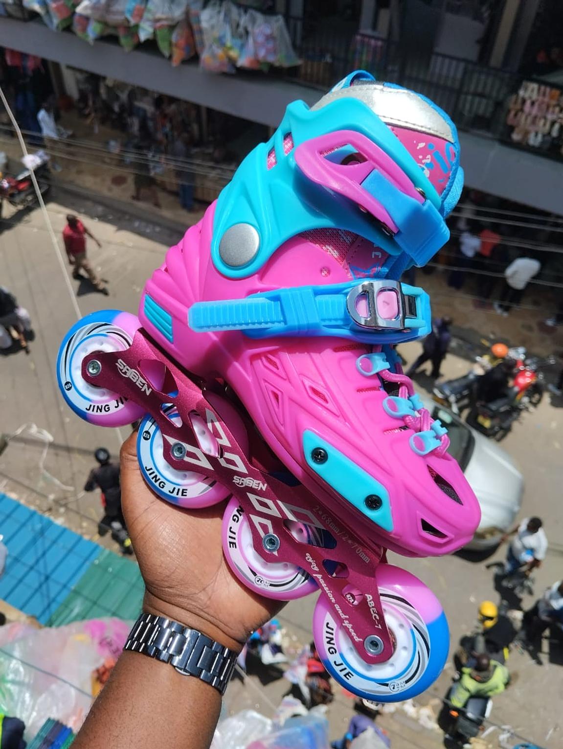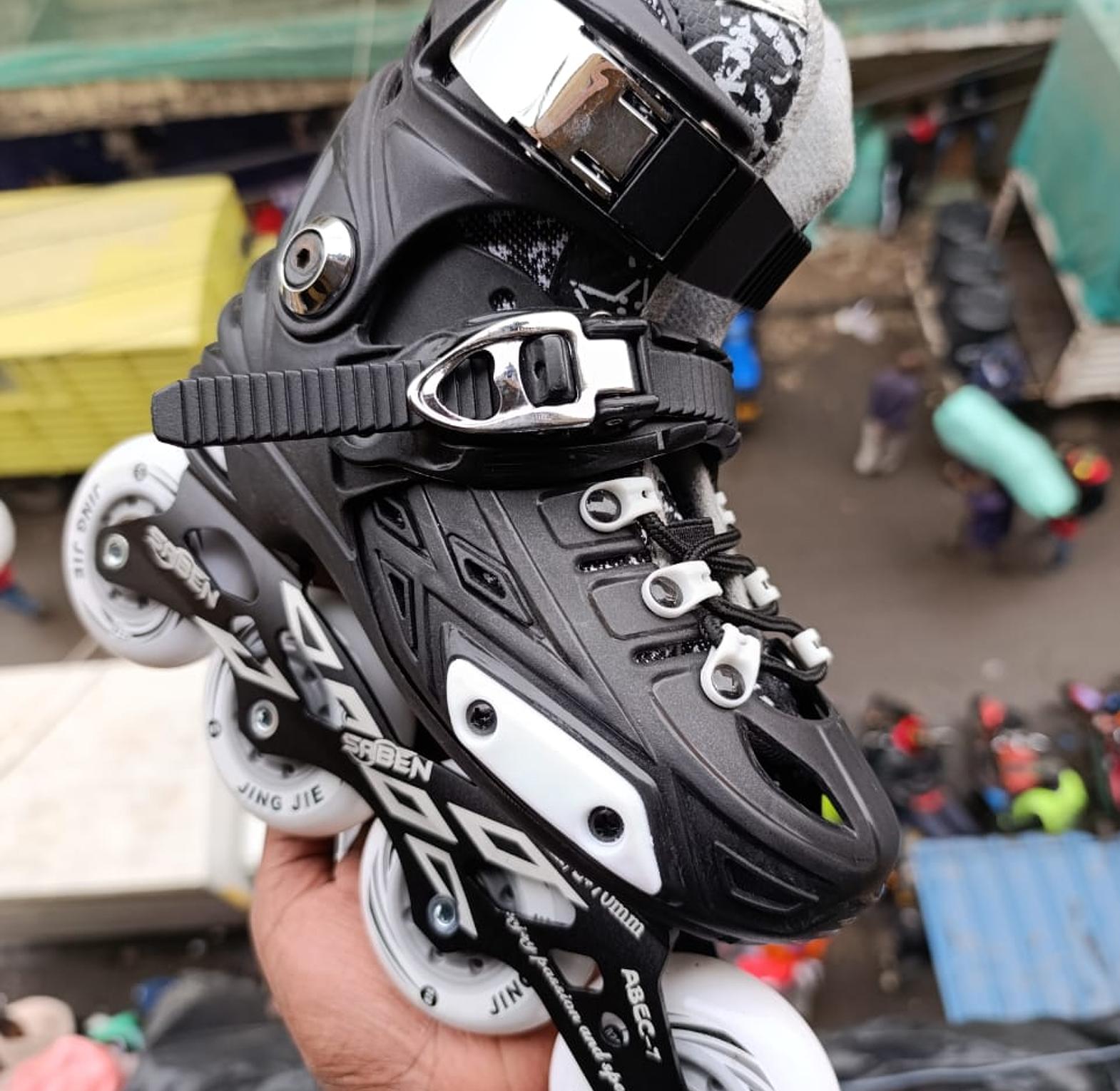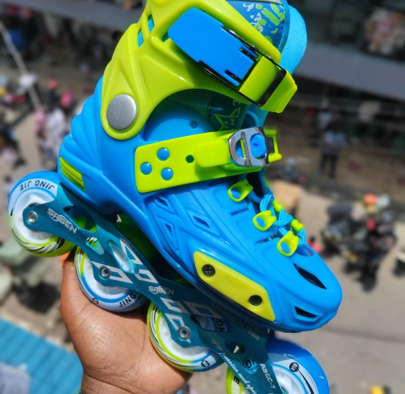 Brand and Model: Saiben Jing Jie Inline Skate. Design: Features a vibrant blue and neon yellow color scheme, with a hard boot construction and adjustable straps for a secure fit.
