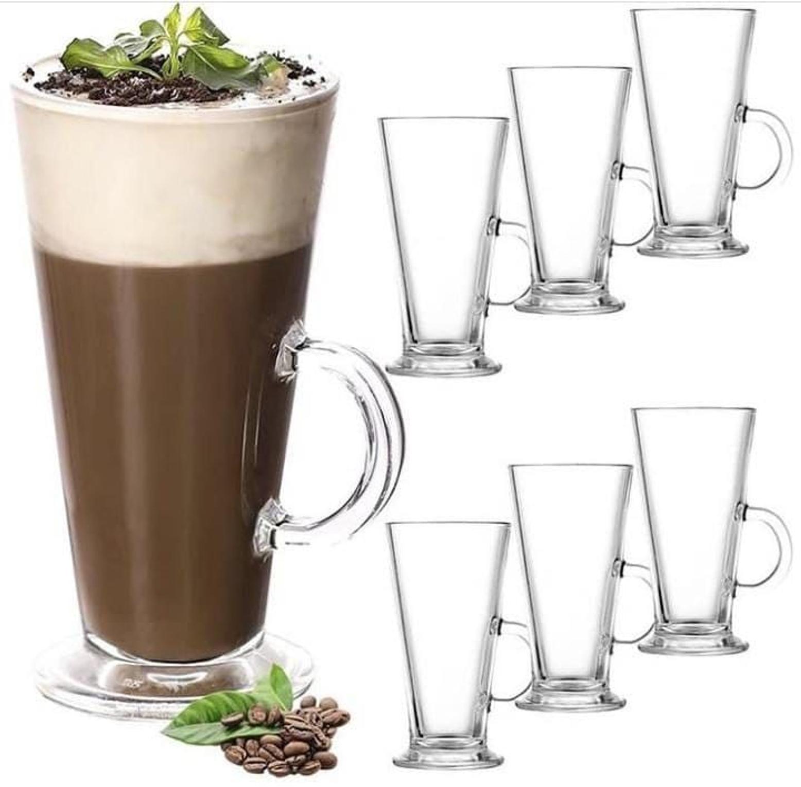 These are transparent glass mugs suitable for serving both hot and cold beverages like lattes, cappuccinos, hot chocolate, iced coffee, and tea. They feature a sturdy base for stability and a comfortable handle to prevent scalding. The design is typically elegant and durable.