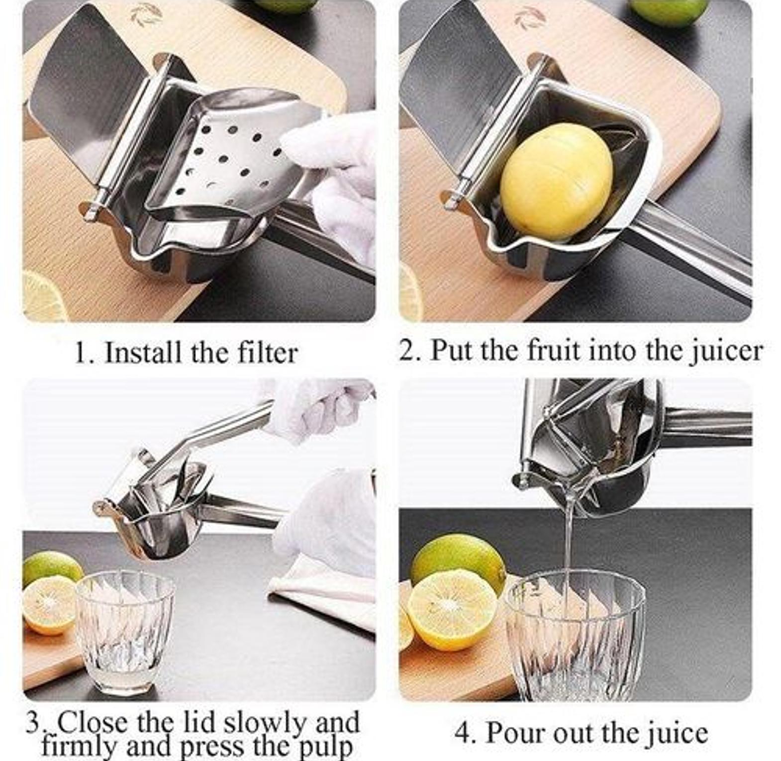 Similar ItemsDescriptionName:Stainless Steel Manual Fruit Juicer Crusher Squeezer Hand Press Lemon Orange Model:F69815 Product Description Material: stainless steel : stainless steel Size: 22x7cm(8.7''x2.8'') Features: ● Manual squeezer, suitable for home/travel/outdoors activities. ● Using food-grade 304 stainless steel material, safe and durable. ● Long service life, durable ● Simple cleaning ● Ergonomic handle, comfortable Instructions 1. Install the filter 2. Put the fruit into the juicer 3. Close the lid slowly and firmly and press the pulp 4. Pour out the juice Application: lemon, orange, watermelon, etc. Package include: ●1 x Manual squeezer Warning: 1.Due to manual measurement, please allow 1-3cm error, thank you 2.Due to shooting problems such as light, there will be chromatic aberration, please be careful.