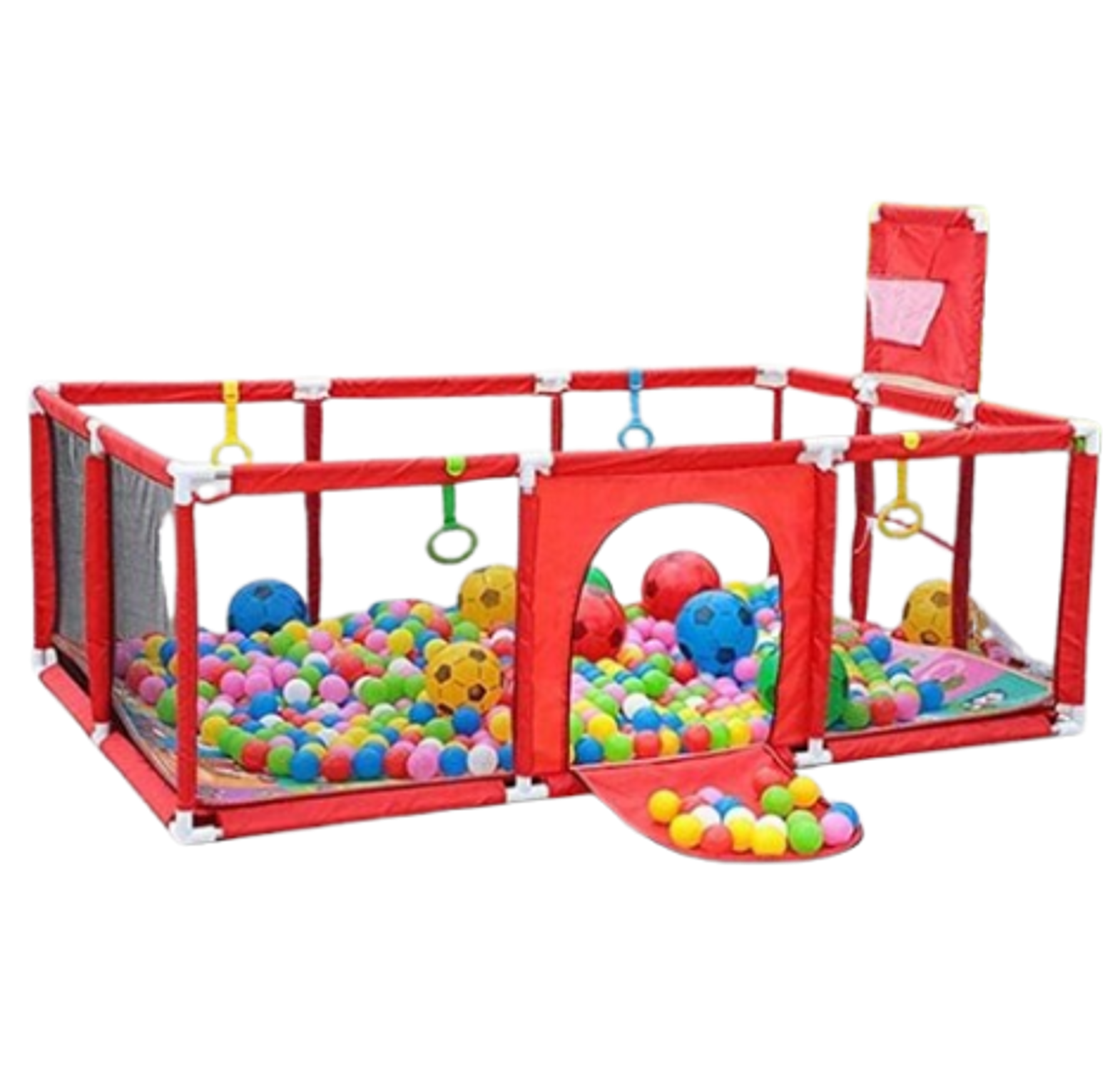 It's a vibrant, portable play area designed for toddlers and young children, suitable for both indoor and outdoor use. It features a sturdy frame, often made of steel tubes, with mesh sidewalls for visibility and ventilation. The playpen typically includes a ball pit with colorful plastic balls, and may also feature a zippered door for easy access, a basketball hoop, and sometimes a small soccer goal for interactive play. It's designed to provide a safe and secure environment for children to play, crawl, and explore, while also promoting motor skills and hand-eye coordination.