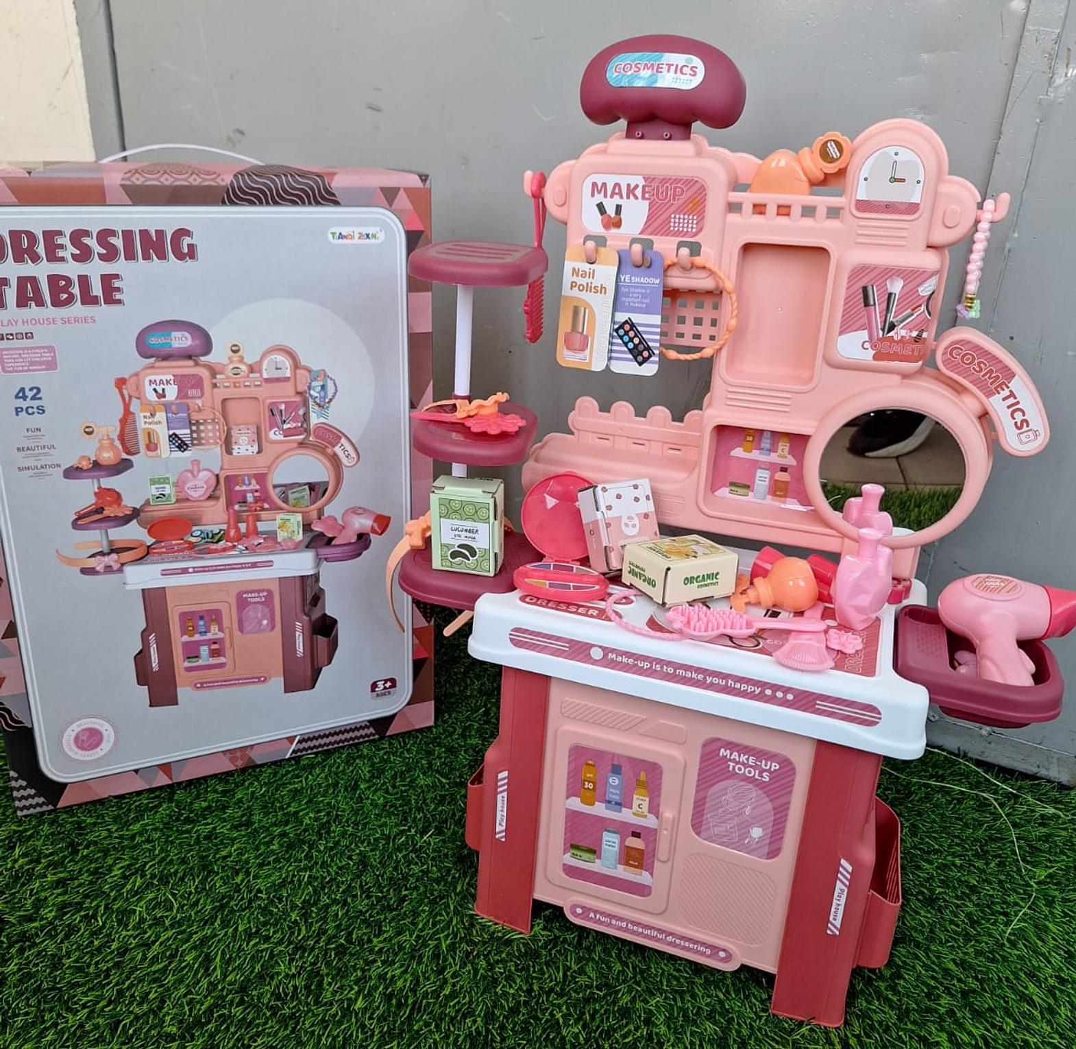 This is an all-in-one vanity playset designed for children, featuring a dressing table with a mirror, along with various pretend makeup items, hair accessories, and beauty tools. It encourages imaginative role-play, creativity, and helps in developing fine motor skills and social interaction. The set is typically made from child-safe, non-toxic plastic and is designed for easy assembly.