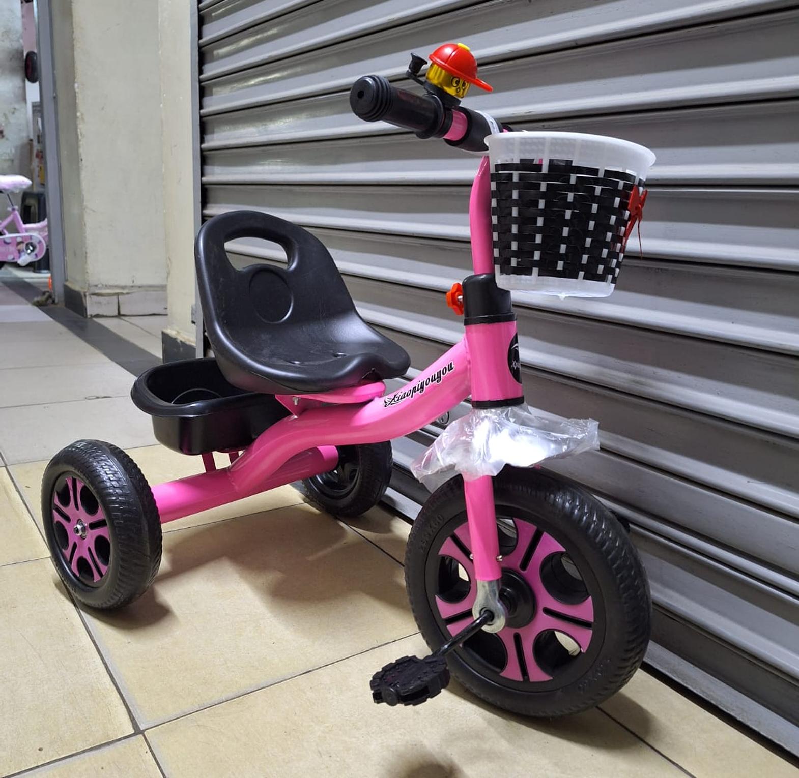 This type of tricycle is designed for young children, typically toddlers aged 18 months to 5 years, to introduce them to cycling in a safe and stable manner. It features a sturdy frame, often made of steel, three wheels for stability, and a comfortable seat. Many models include features like a bell, a front basket, and a rear storage bin, as seen in the image.