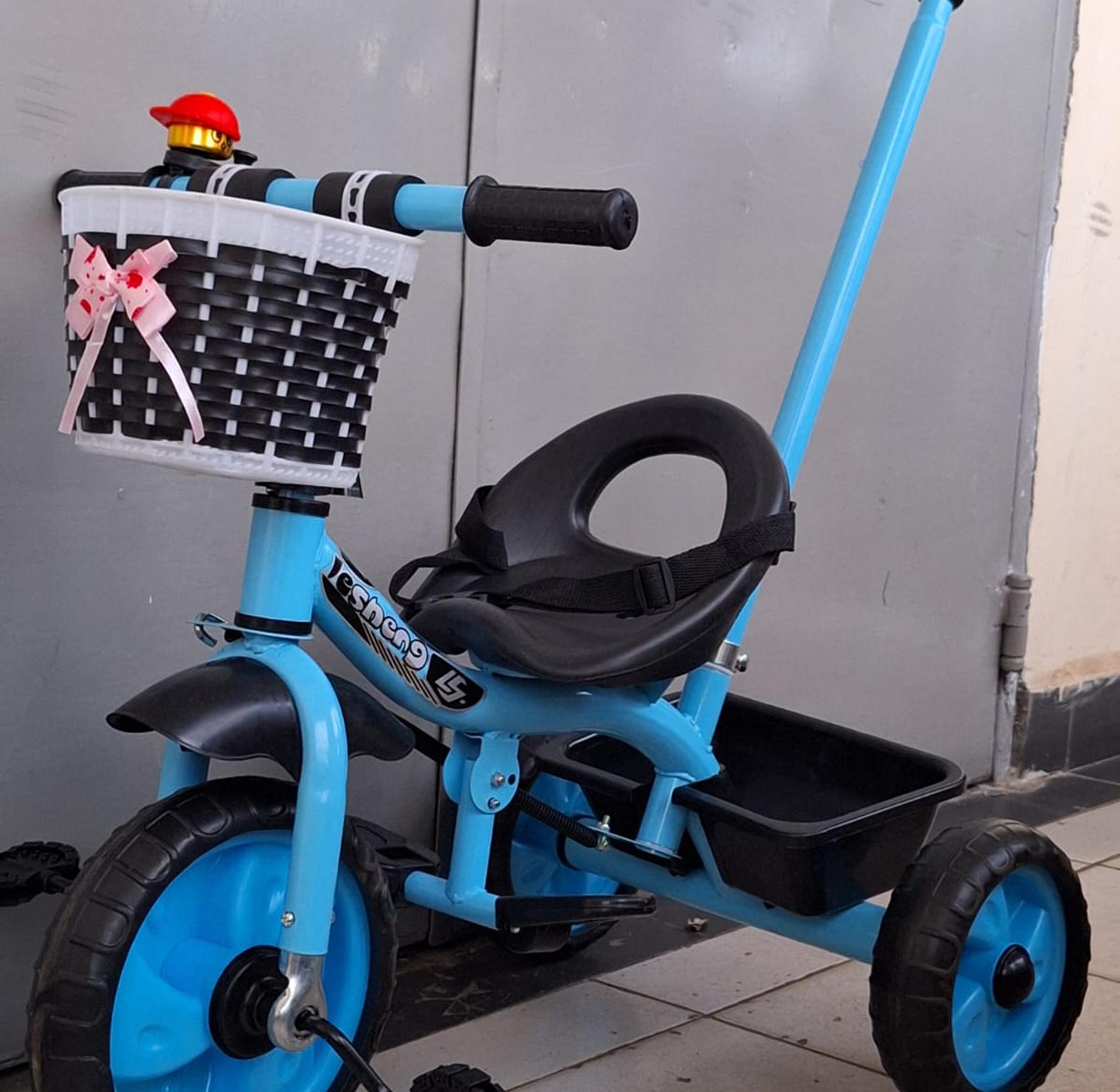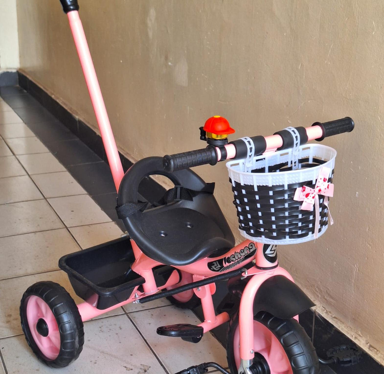 This is a three-wheeled ride-on toy designed for toddlers and young children, combining the stability of a tricycle with the added convenience of a parental push handle for steering and guidance. It features a comfortable seat, non-slip pedals, and a rear storage basket for carrying items.