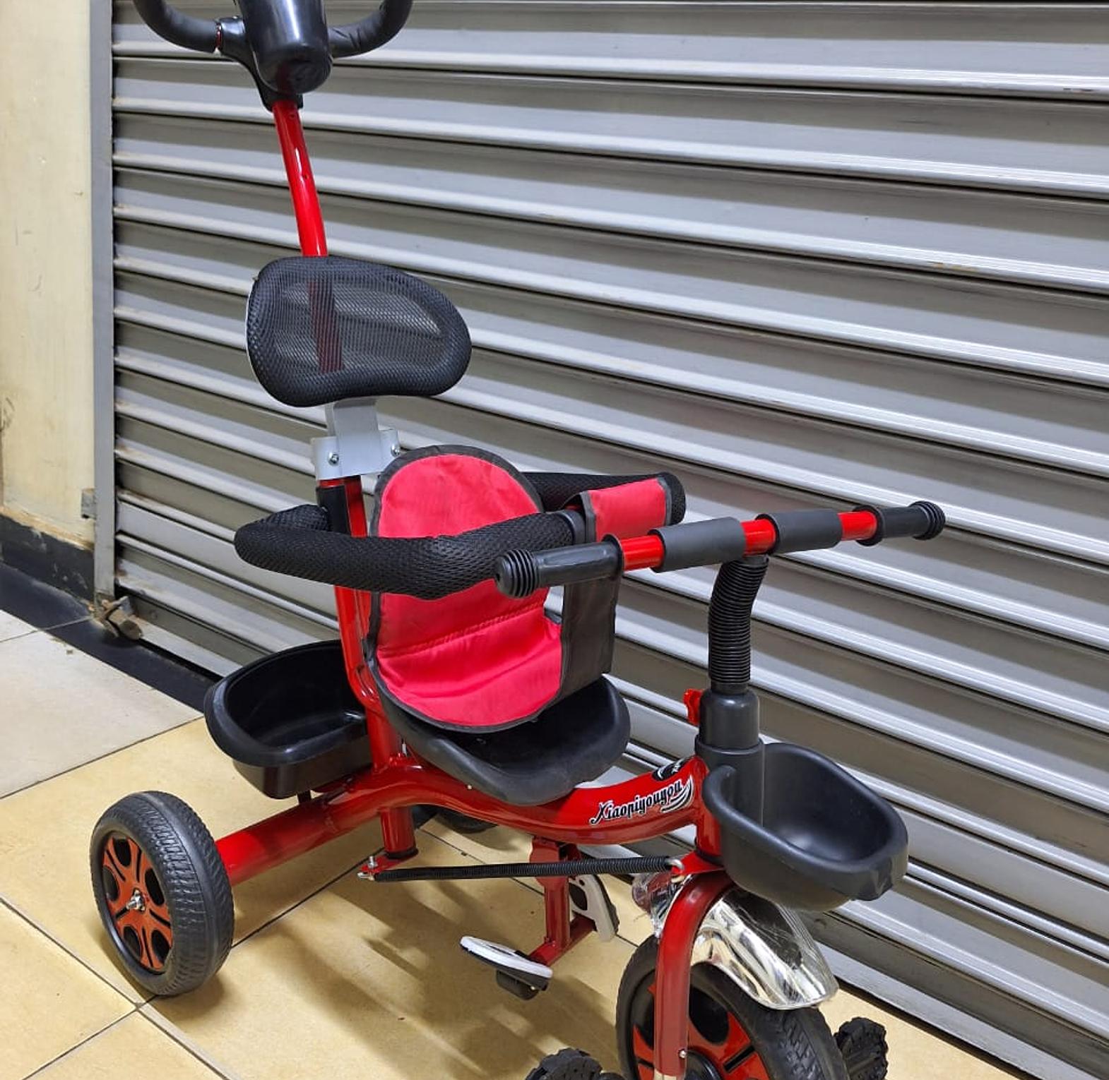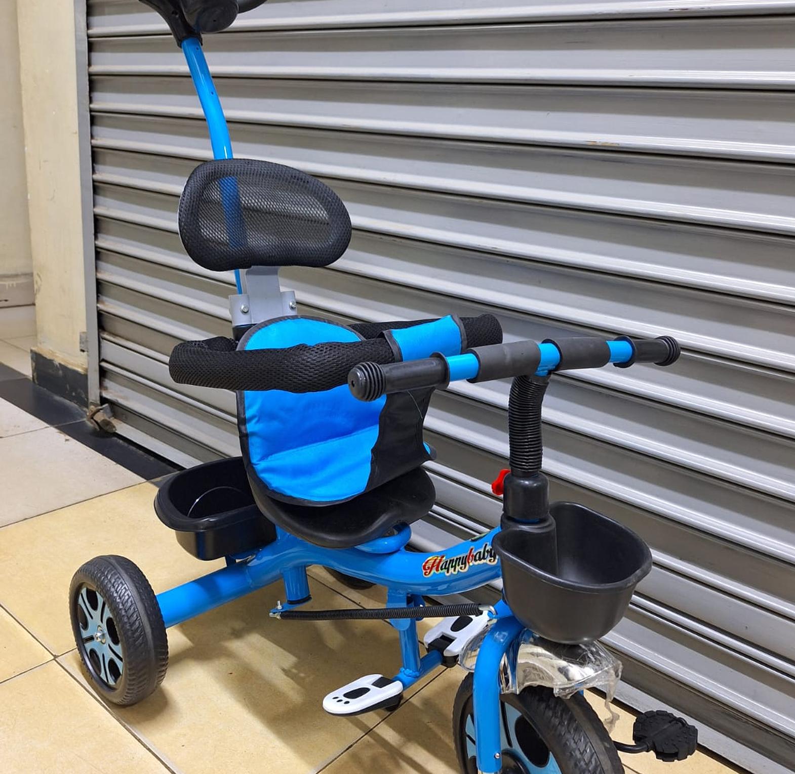 Has a push handle Portable Adjustable handle Has resting legs pedals for babies Has cycling pedals