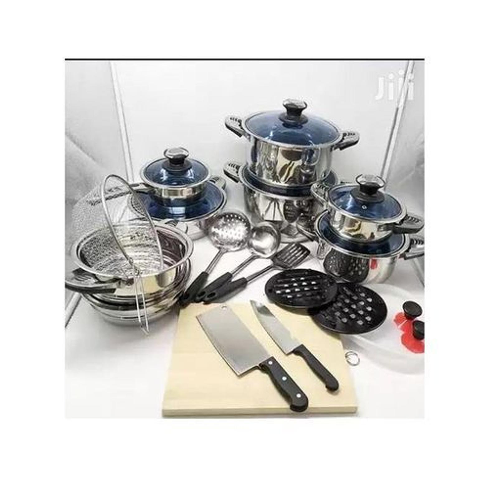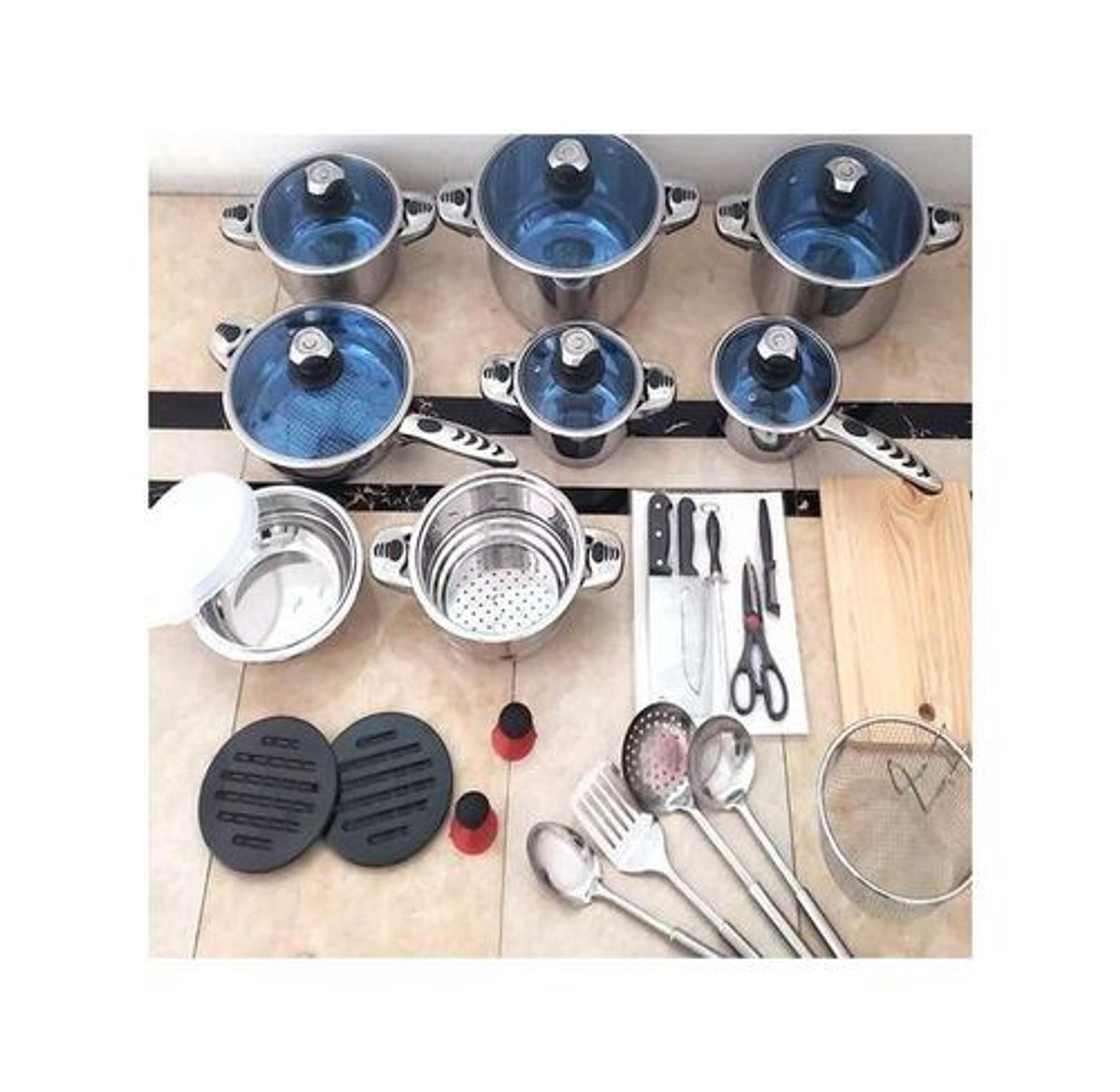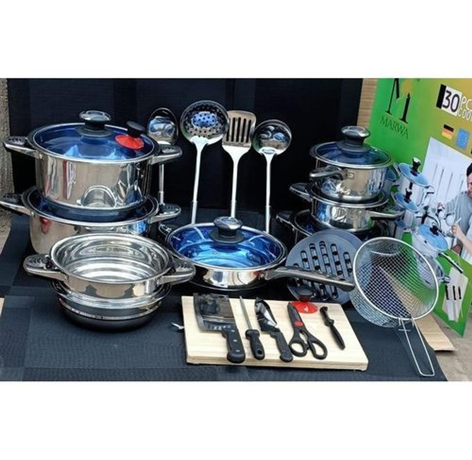 Buy MARWA 30 Pcs Stainless Steel Cookware Set Cooking Pots which is made from durable stainless steel cooking pots provides long-lasting superior .Non-stick performance. This 30 Pcs Stainless Steel Cookware Set Cooking Pot has different sizes for different cooking needs hence you can cook different delicacies. It is light and easy to maintain with a protective layer added to make it less reactive and more scratch-resistant. 30 Pcs Stainless Steel Cookware Set Cooking Pots also has Glass lids makes viewing food easy from start to finish. It is both a healthy and Eco-friendly way to cook, suitable for home, can be used for a long time. Furthermore, this cookware set spreads heat evenly and is energy efficient, and makes it easier to regulate heat so the food does not burn and stick.