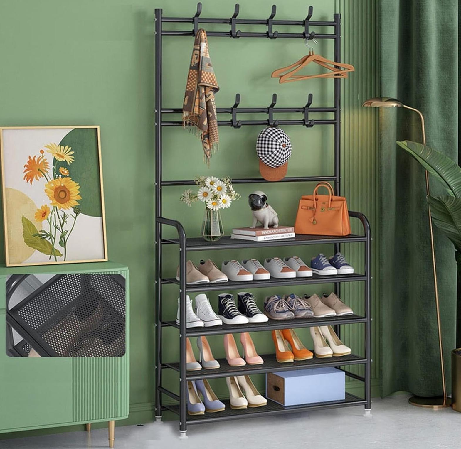 1. Material upgrade. Adopting thicker steel pipe, it can support heavier shoes and hats, avoiding bending, tipping and so on. 2. Tighter connectors. Adopting higher precision connectors to connect more tightly and strengthen the stability. 3. Luxurious appearance. Adopting black glossy metal color, it is more in line with modern home decoration and enhances the quality of the family. 4. More space. Upgraded model, 5 layers of shoe storage space, 80cm length, can place more shoes, the first layer can also be placed on socks and other objects.8 hooks, can be placed at the same time keys, hats, scarves, umbrellas and other objects. 5. Better cleaning. The bottom is away from the ground to avoid dust accumulation. Each layer is separated by pp compartment cloth to block dust from filling each layer. 6. More space to use. Waterproof, not only can be used as a shoe cabinet, but also can be placed in the bathroom.