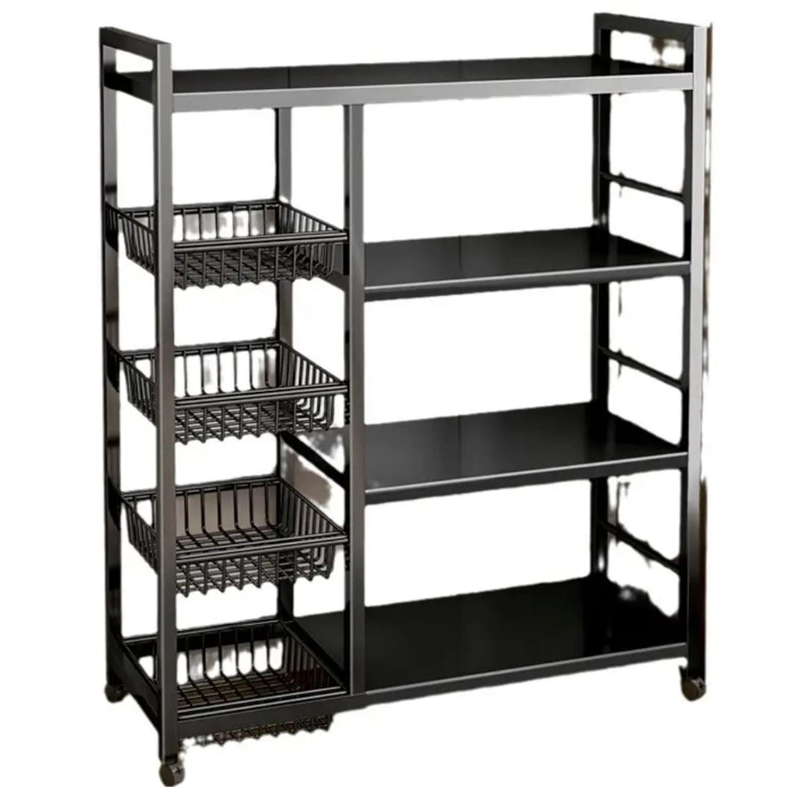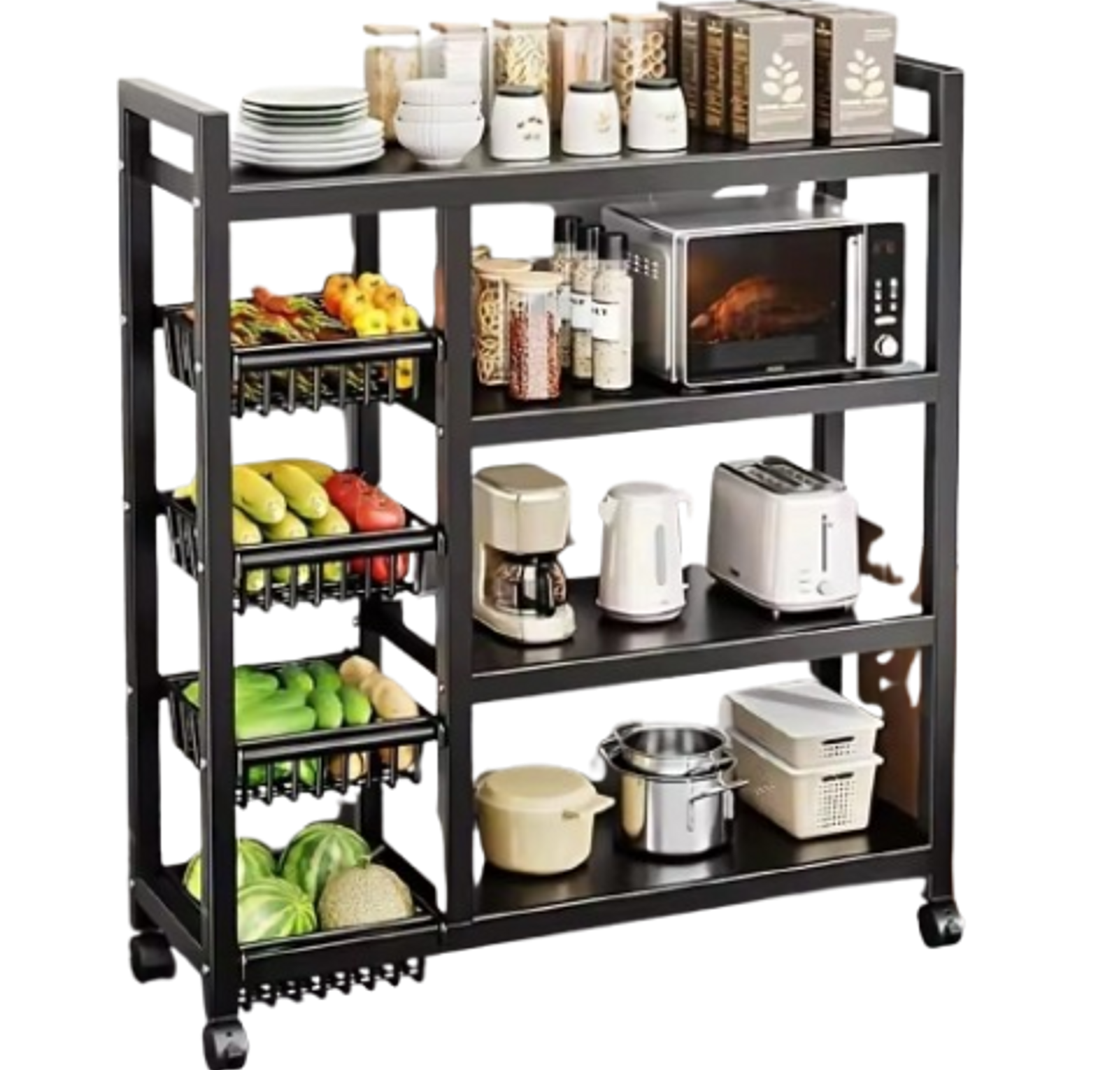 This rack is designed for kitchen storage and organization, featuring multiple tiers of shelving and integrated baskets for various items like appliances, cookware, pantry goods, and produce. It is constructed from a sturdy metallic material, often carbon steel, ensuring durability and strong load-bearing capacity. Many versions include movable and lockable wheels for easy relocation and stability, or adjustable feet for uneven surfaces.