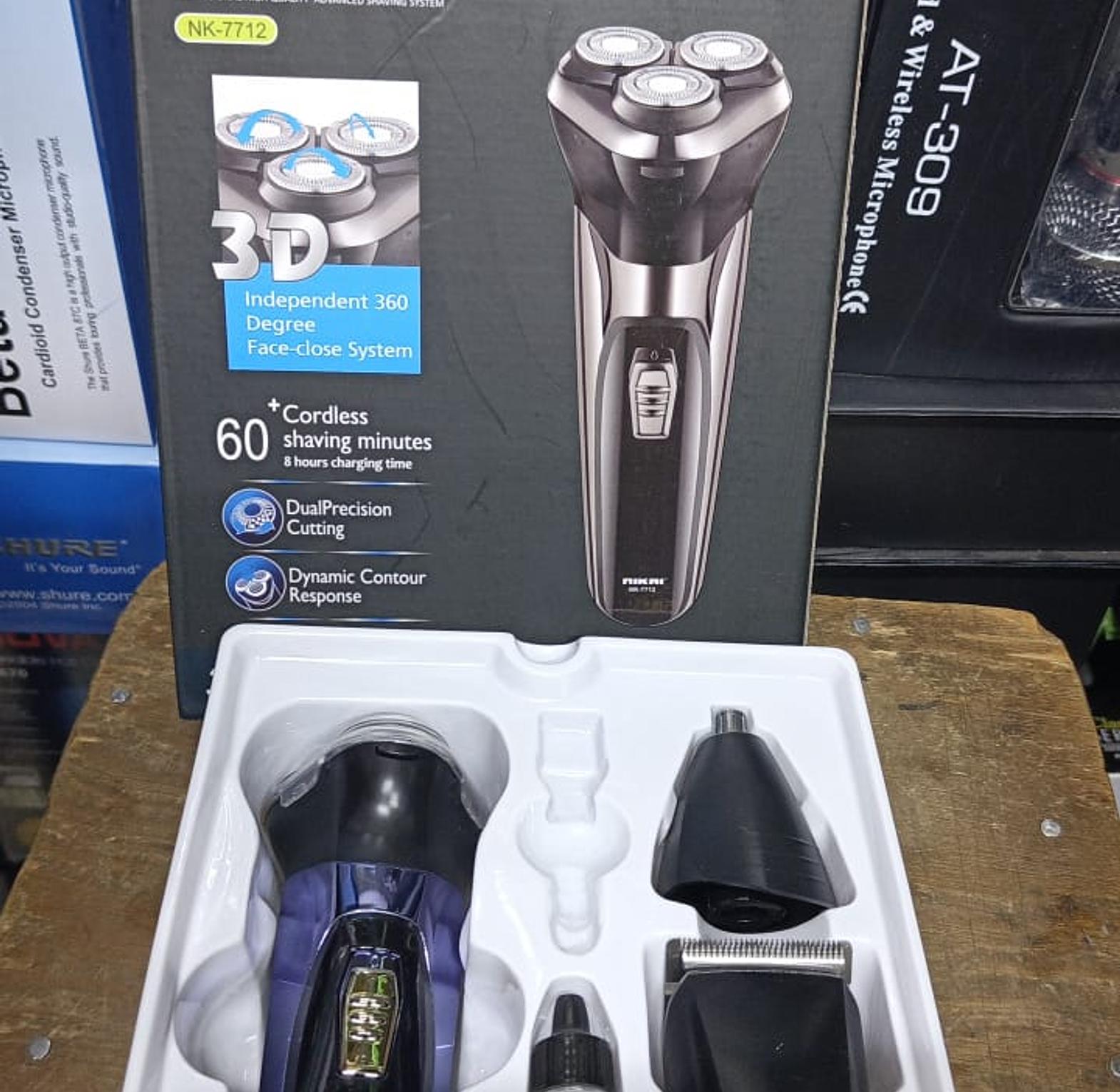 Name: Nikai 3 in 1 Grooming Kit Model: NK-7712 Functionality: This kit serves as a rechargeable shaver, hair clipper, and nose trimmer, offering a versatile grooming solution.