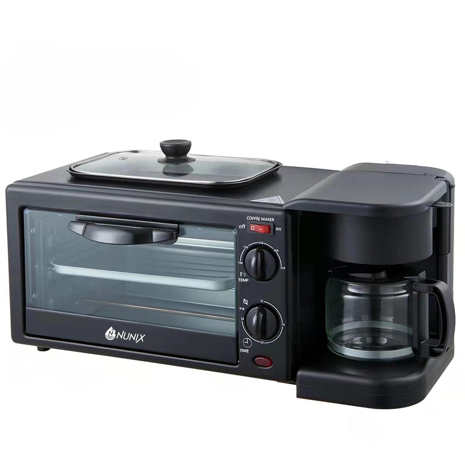3-In-1: This versatile breakfast station covers your entire morning breakfast, allowing you to make your Coffee, toast and eggs all at once Multi-functioning toaster: The toaster oven has a 30-minute timer with a glass door and can fit up to 4 slices of bread, a 7-inch pizza and can be used to make casseroles, cookies and other delicious meals 4-Cup Coffee maker: This coffeemaker brews up to 4 cups at a time in minutes, so you can enjoy a cup of Coffee while your food cooks. Comes with a glass carafe, a coffee scoop and a reusable filter Family-sized griddle: The large non-stick griddle offers plenty of room to fry eggs, omelets, pancakes, sausages, bacon, hash browns and other breakfast foods - and comes with a glass lid Easy clean up: As if cooking isn't easy enough, the oven tray, wire rack, crumb tray and nonstick griddle are removable, making cleanup a breeze