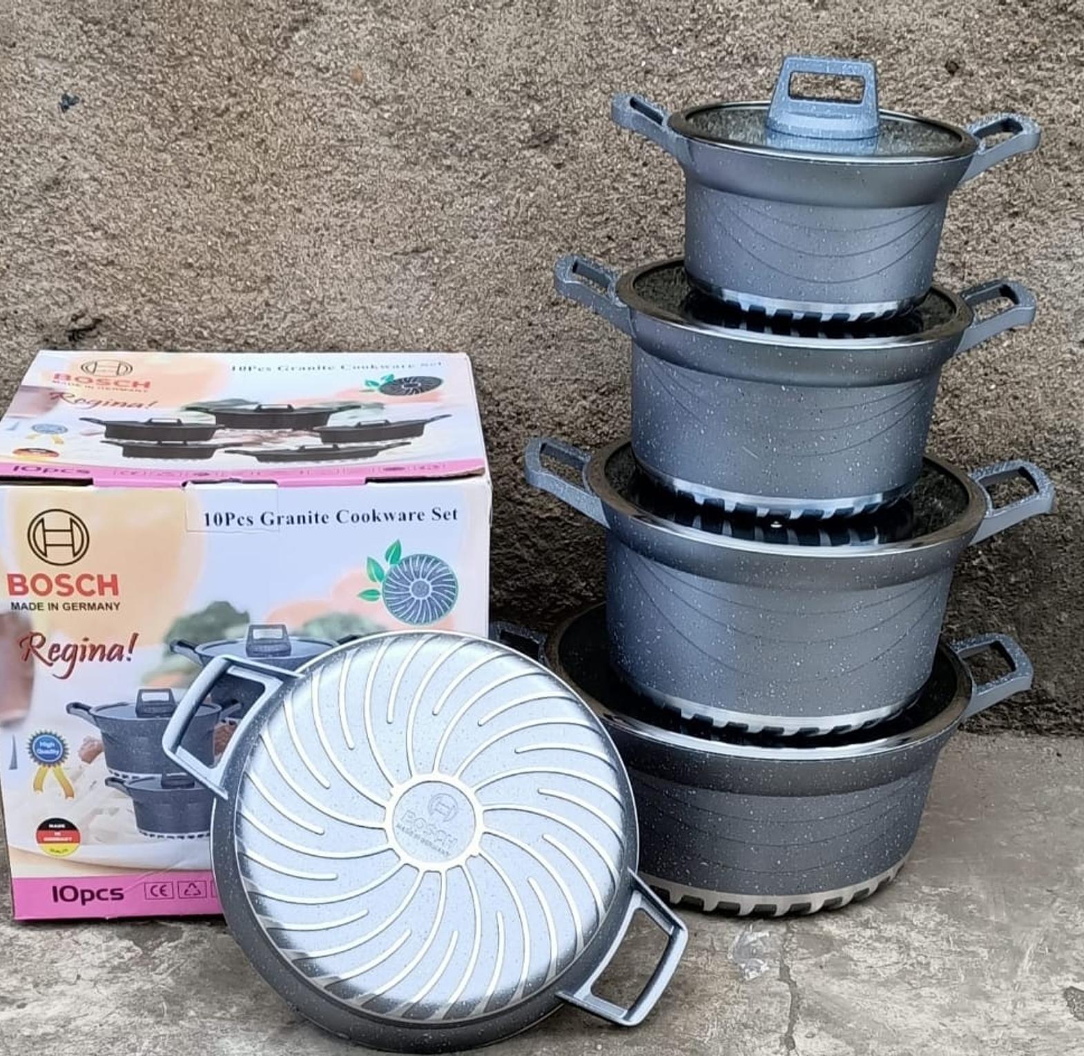 10-piece granite non-stick cookware set with glass lids, reinforced coating, and heat-efficient base.