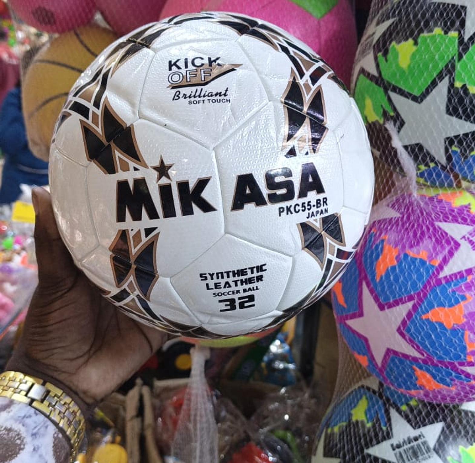 Name: Mikasa PKC55-BR Kick Off Brilliant Soccer Ball Material: Made of synthetic leather (TPU + EVA). It features a soft-touch design. Construction: Utilizes classic 32-panel sewing technology, ensuring good flexibility and durability. It is hand-stitched for consistent performance. Size: Official size 5.