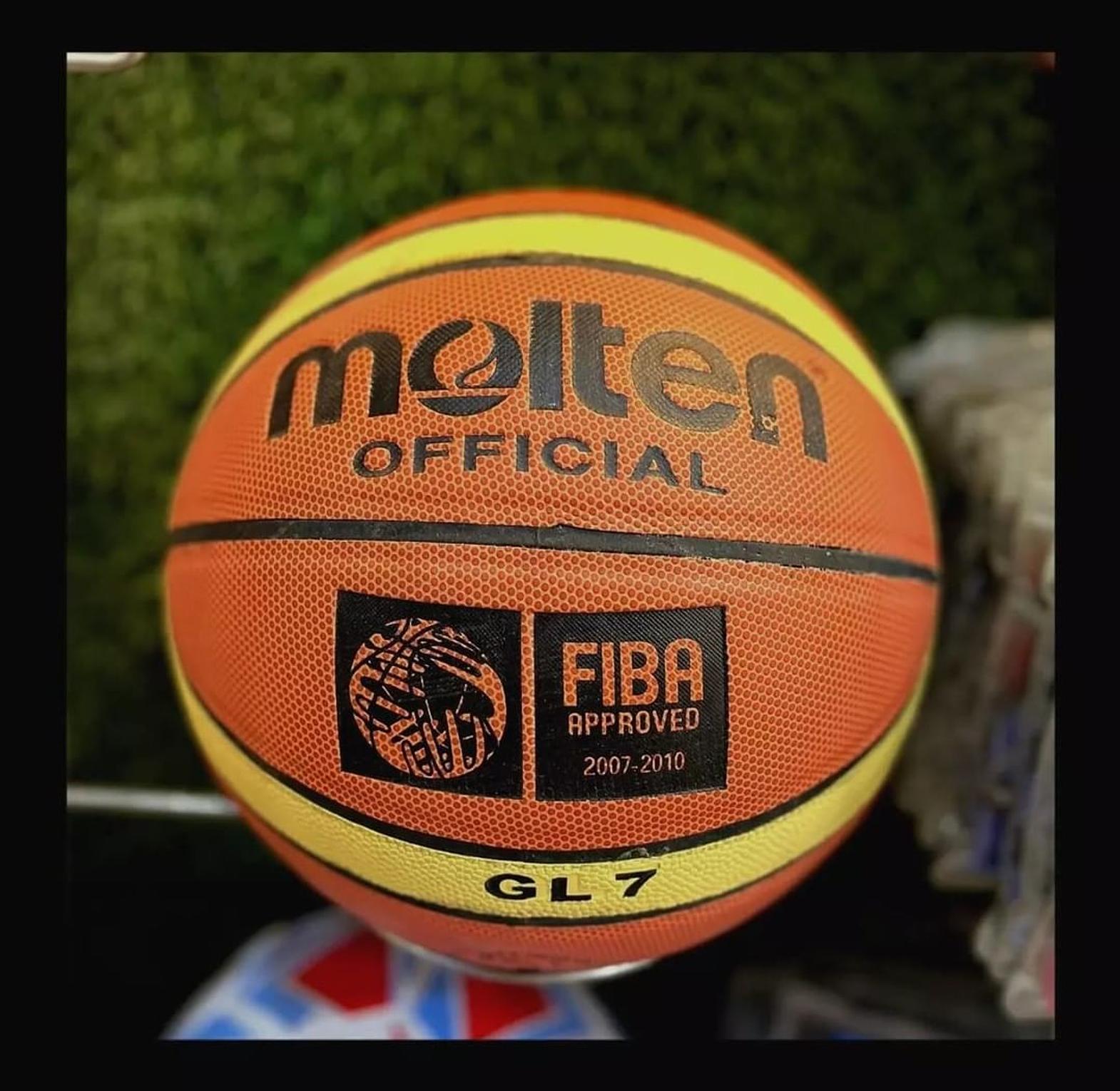 High-quality Molten GL7 basketball made from premium leather, designed for official FIBA play in adult size 7.