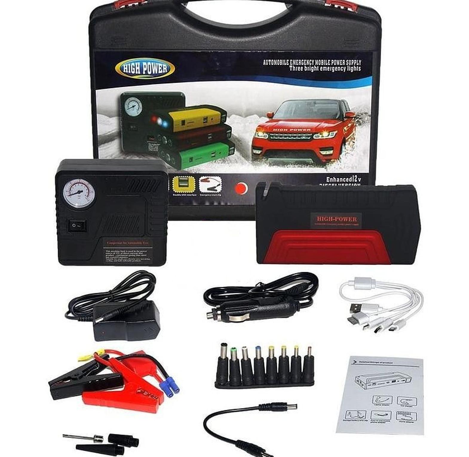 Buy today this Emergency Car Jump starter Kit. High Capacity battery power bank 280000mAh .Automated tyre inflator complete with a pressure gauge in psi.Inflates also bicycles, balloons, balls Can charge both android and iPhone/ iPad via USB connection Charges a wide range of other electronics like cameras, laptops, play stations etc Voltage selector between 12, 16 & 19 volts. Power bank battery can be charged both from AC mains and the car lighter ports. Very bright torch. Emergency strobe/ hazard lights Light weight; only 450 gms. Reasonably priced Emergency Car Jump starter Kit. High Capacity battery power bank - 280000mAh Automated tyre inflator complete with a pressure gauge in psi. Inflates also bicycles, balloons, balls. Can charge android and iPhone/ iPad via USB connection .Charges a wide range of other electronics like cameras, laptops, play stations etc Power bank battery can be charged both from AC mains and the car lighter ports. Very bright torch. Emergency strobe/ hazard lights. Light weight; only 450 gms.