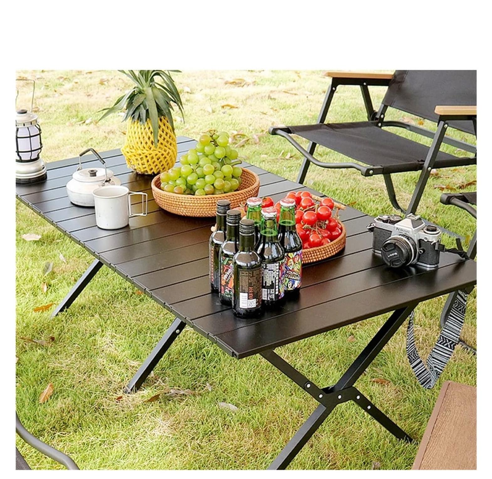 This type of table is designed for outdoor use, such as camping, picnics, BBQs, and backyard parties, but can also be used indoors. It features a lightweight and compact design, often with an "egg roll" folding top and a sturdy X-shaped frame for stability. Many models come with a carrying bag for easy transport and storage. The surface is typically wear-resistant and designed to withstand outdoor conditions.