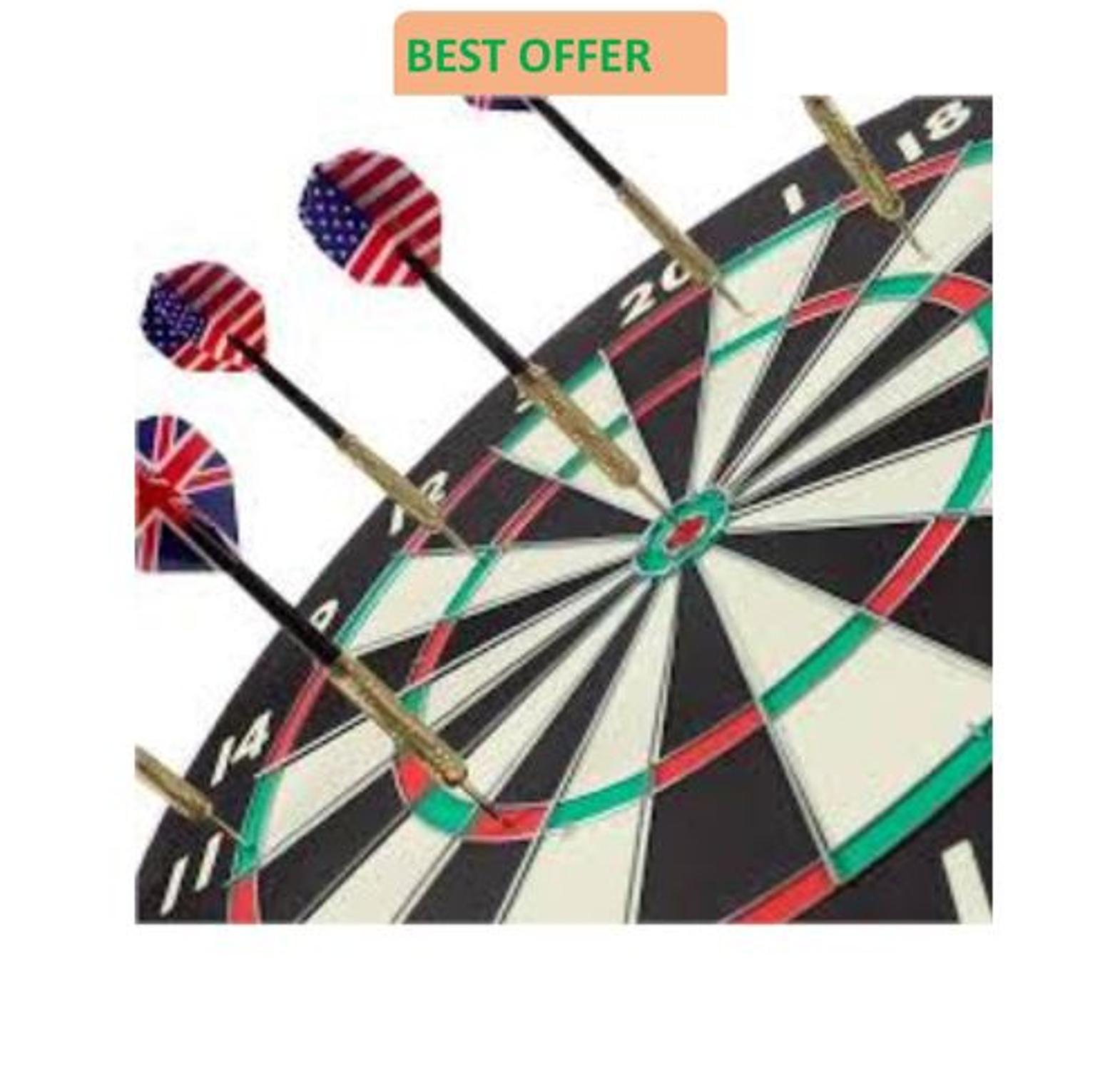 With a complete staple-free dartboard wire system, the scoring area of the Assassin Pro dart boards is 15% larger than that of regular dartboards. Reduce your bounce-outs and boost your scores with the cutting-edge, ultra-slim segmentation system that’s 65% thinner than the conventional round wireframe.The user-friendly mounting kit includes all the hardware and instructions you need to secure your bristle dartboard in no time. With a darts oche tape for accurate setup, this ready-to-use darts board set offers you a stress-free experience.The sturdy brass steel tip darts set in this bundle are easy to carry and store in its innovative case with magnetic closure. The uniquely-designed box features a custom-made EVA foam insert to protect your darts set from scratches. This professional darts steel tip set contains darts of 22g with strategically-knurled brass barrels that will offer you optimum grip, lift, and stability. The steel darts are fitted with rubber O-rings to avoid the shafts from loosening. Our dartboard and darts set also contain a dart sharpener that will help you minimize bounce-outs by keeping the tips of your darts sharp.