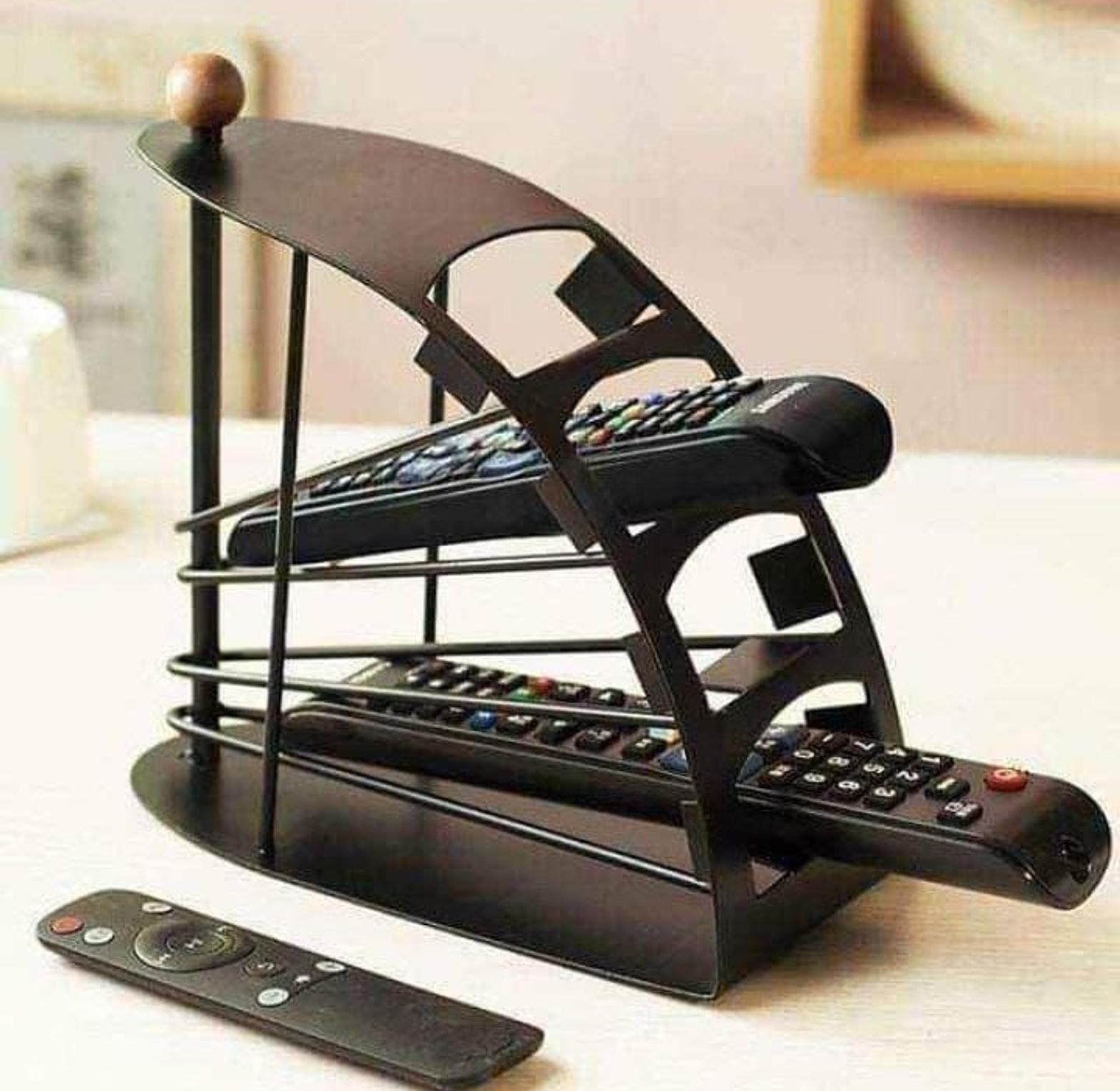 Remote control organizer rack featuring a convenient curved shape and a black finish. The curved, fan-like design keeps all 4 slots arranged so that the remotes you store inside will be easy to see and easy to reach. Can be set on any end table, coffee table or other surface in your living room to keep your remote controls close at hand. TV Remote Stand, the Remote Control Caddy keeps all your remotes in place Remote Control Caddy or Remote stand organizes all of your handheld remotes. Convenient table-top holder features a stylish curved, stair-step shape that keeps up to four remote controls in view and easily accessible. No more lost or misplaced remotes! Slim design takes up very little space on your coffee or end table. Features: - Slim design takes up very little space - End the task of searching for the remotes - Ideal on your coffee or end tables - Ideal for living room, bedroom and more. Built to fit any type of remote control including TV Remotes, Stereo Remotes, Soundbar Remotes, Game Console Media Remotes and more