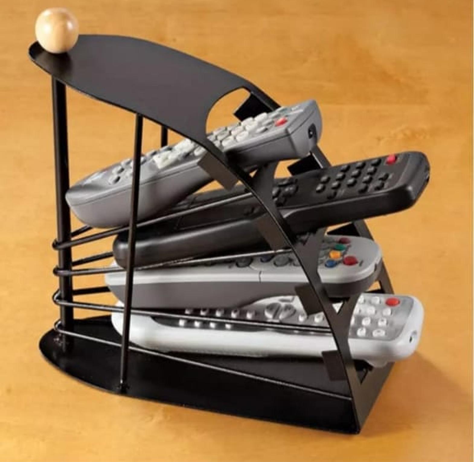 Remote control organizer rack featuring a convenient curved shape and a black finish. The curved, fan-like design keeps all 4 slots arranged so that the remotes you store inside will be easy to see and easy to reach. Can be set on any end table, coffee table or other surface in your living room to keep your remote controls close at hand. TV Remote Stand, the Remote Control Caddy keeps all your remotes in place Remote Control Caddy or Remote stand organizes all of your handheld remotes. Convenient table-top holder features a stylish curved, stair-step shape that keeps up to four remote controls in view and easily accessible. No more lost or misplaced remotes! Slim design takes up very little space on your coffee or end table. Features: - Slim design takes up very little space - End the task of searching for the remotes - Ideal on your coffee or end tables - Ideal for living room, bedroom and more. Built to fit any type of remote control including TV Remotes, Stereo Remotes, Soundbar Remotes, Game Console Media Remotes and more