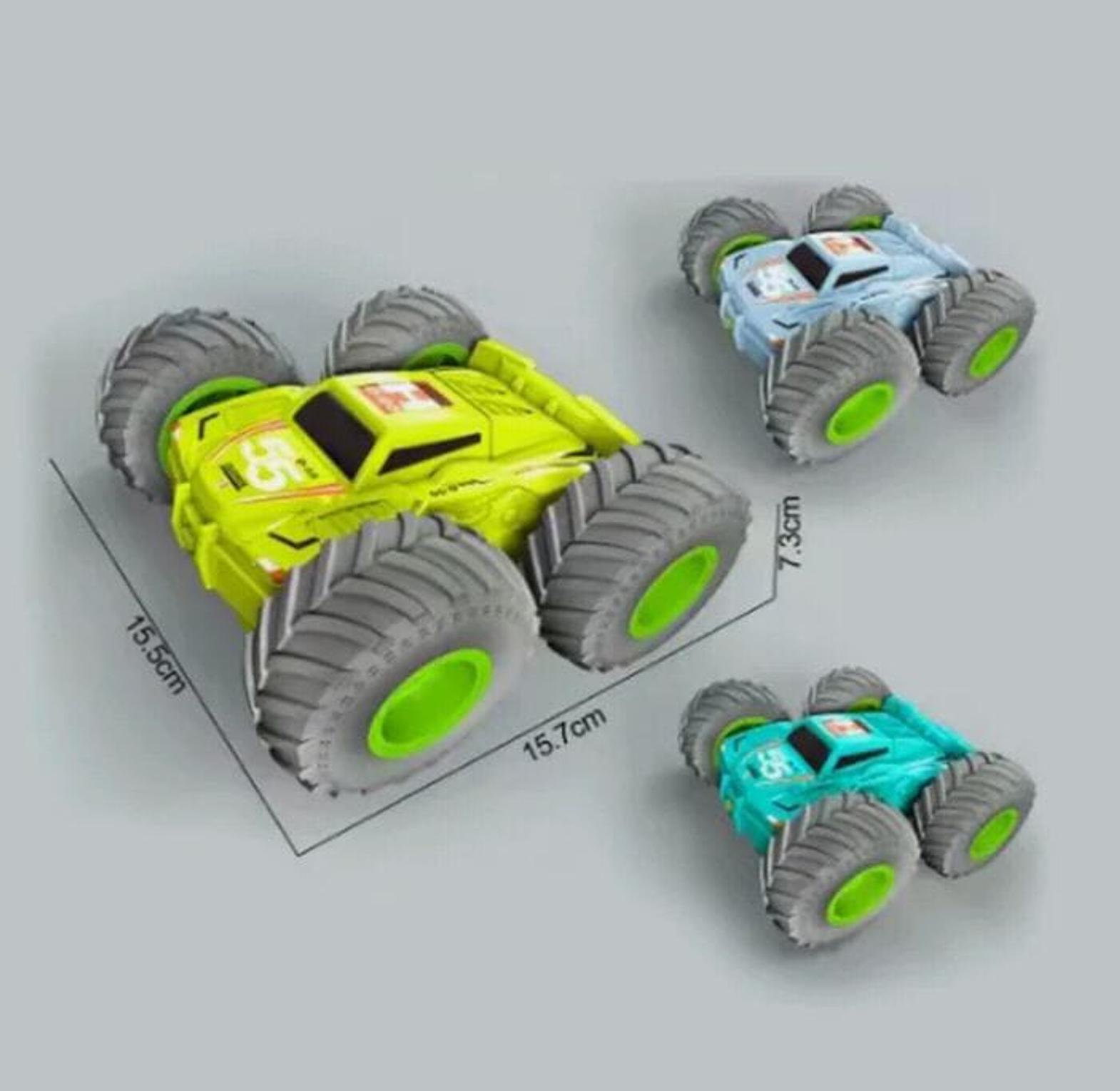 t is a remote control car designed for performing stunts, indicated by its robust build and large wheels suitable for off-road or varied terrains. The car features a bright lime green body with black and green wheels, and it comes with a separate remote control unit. Markings such as "DASHER" and "D-55" are visible on the car's body.
