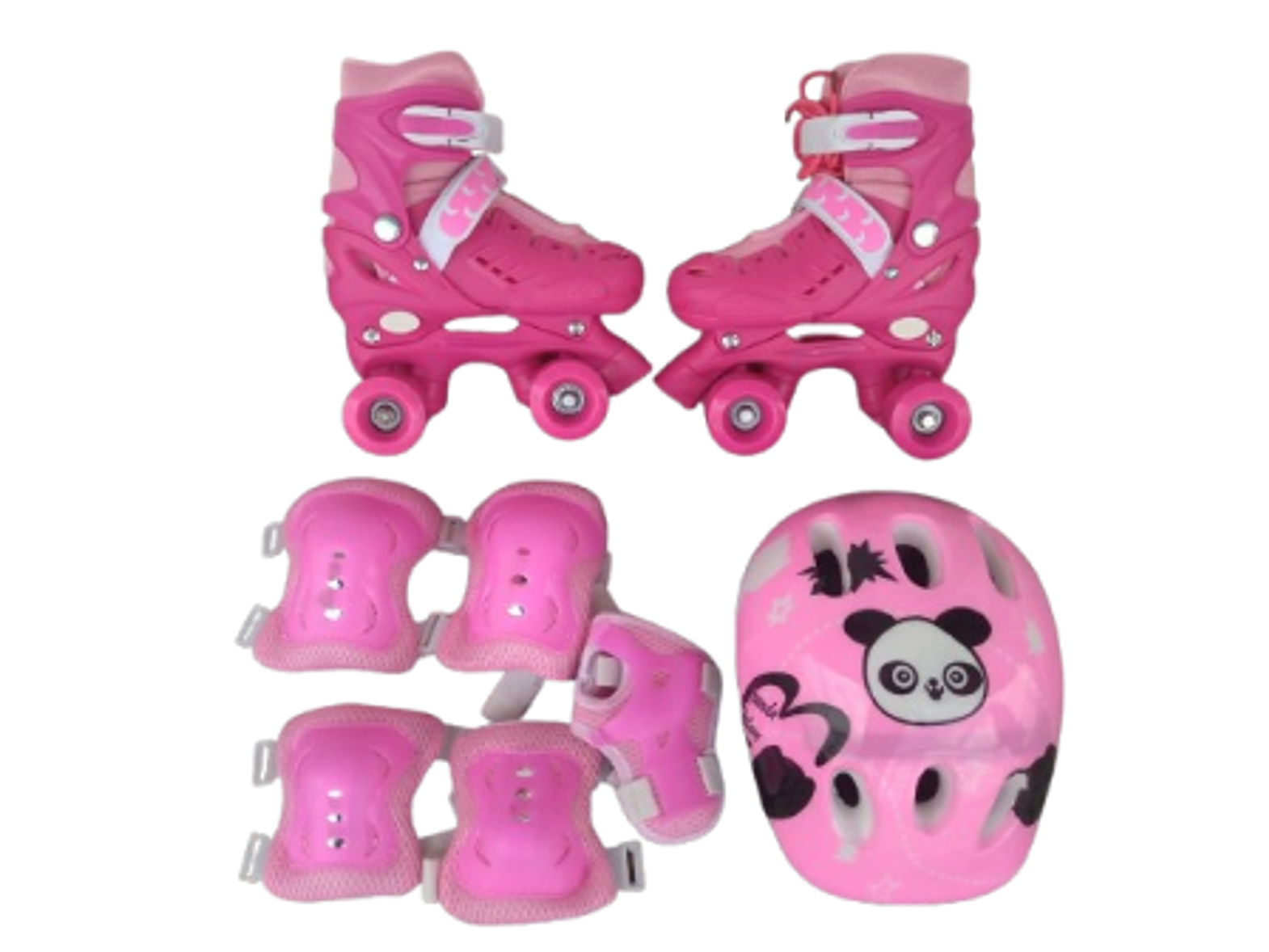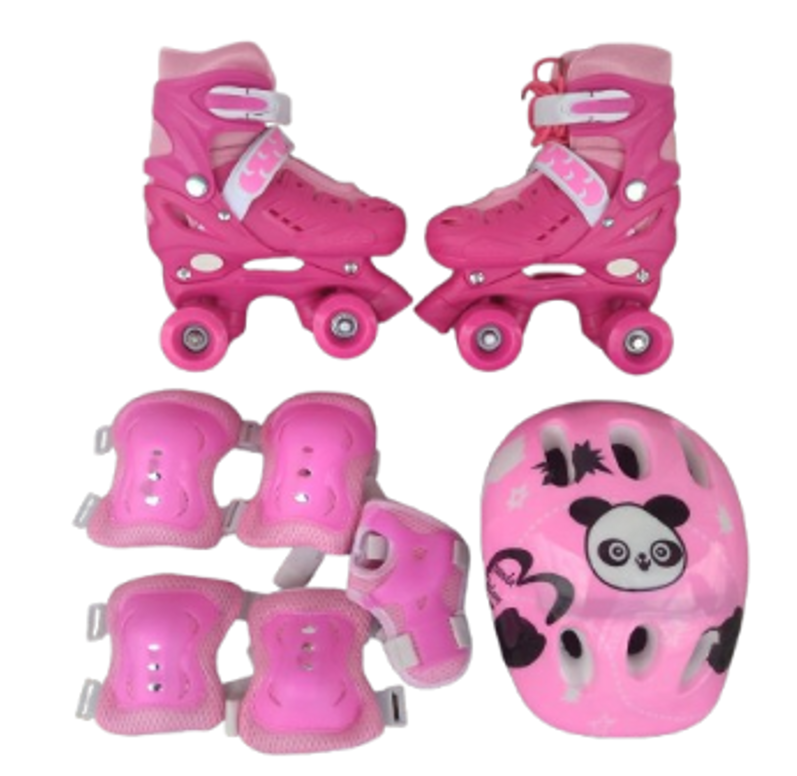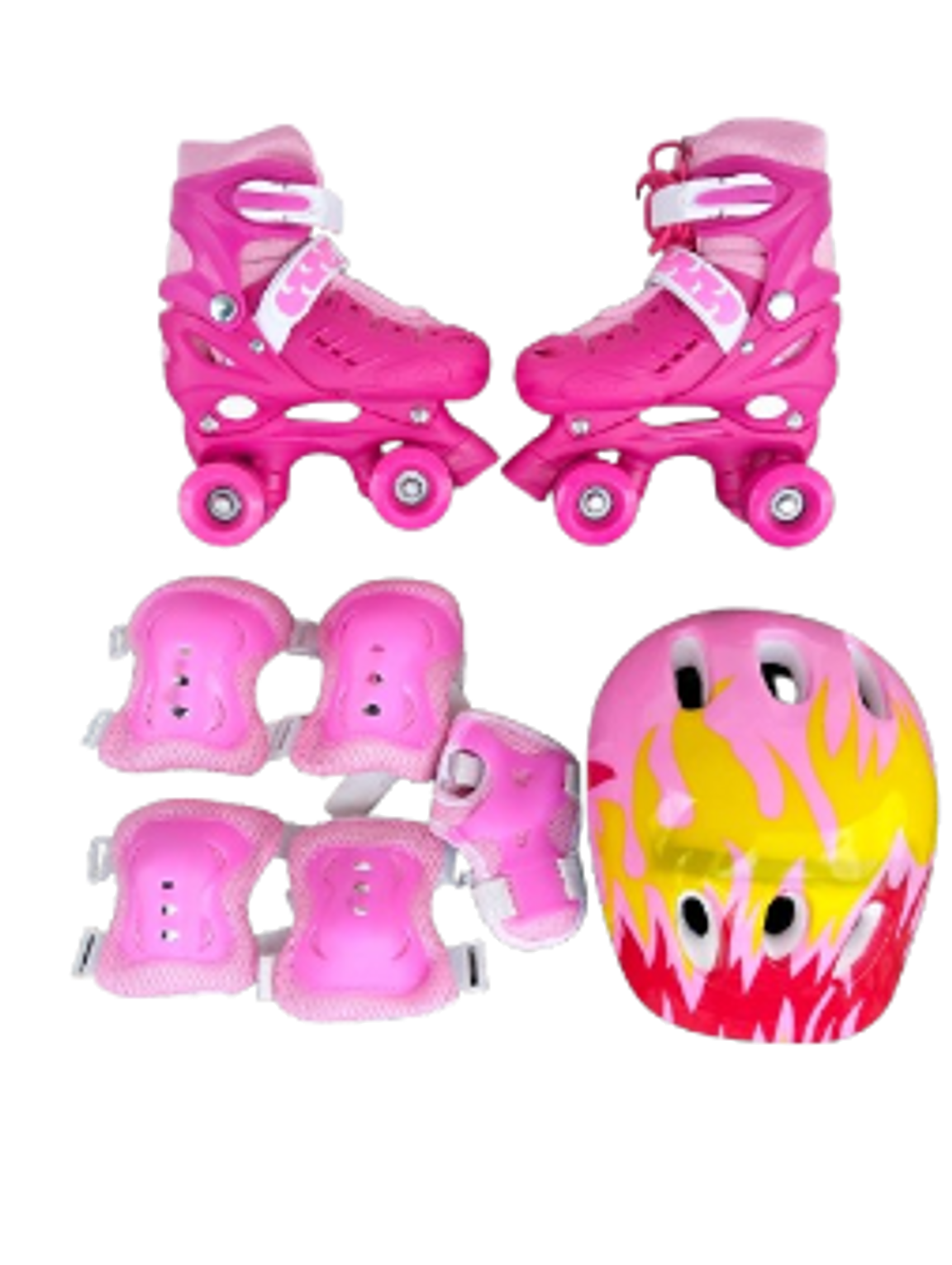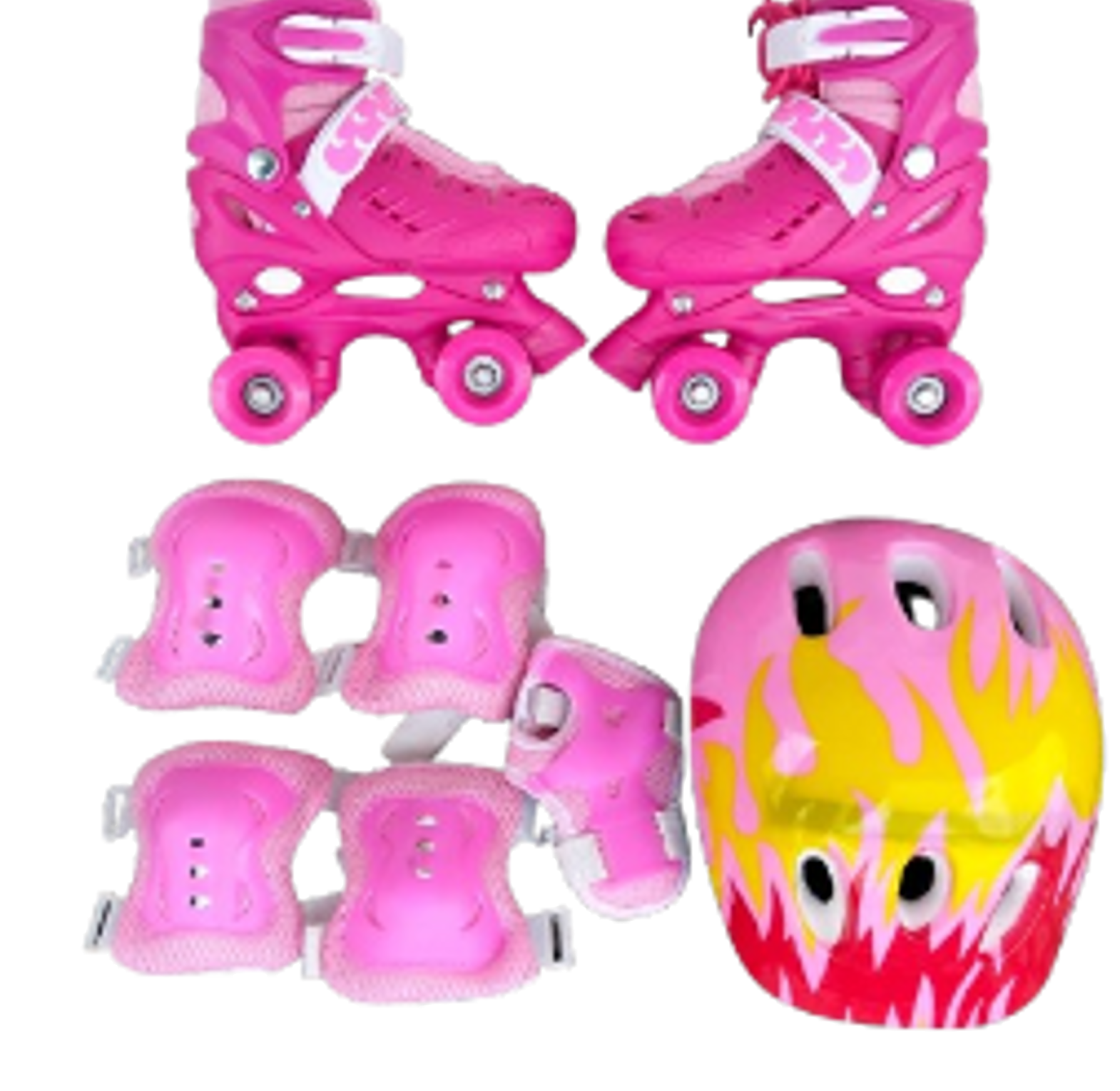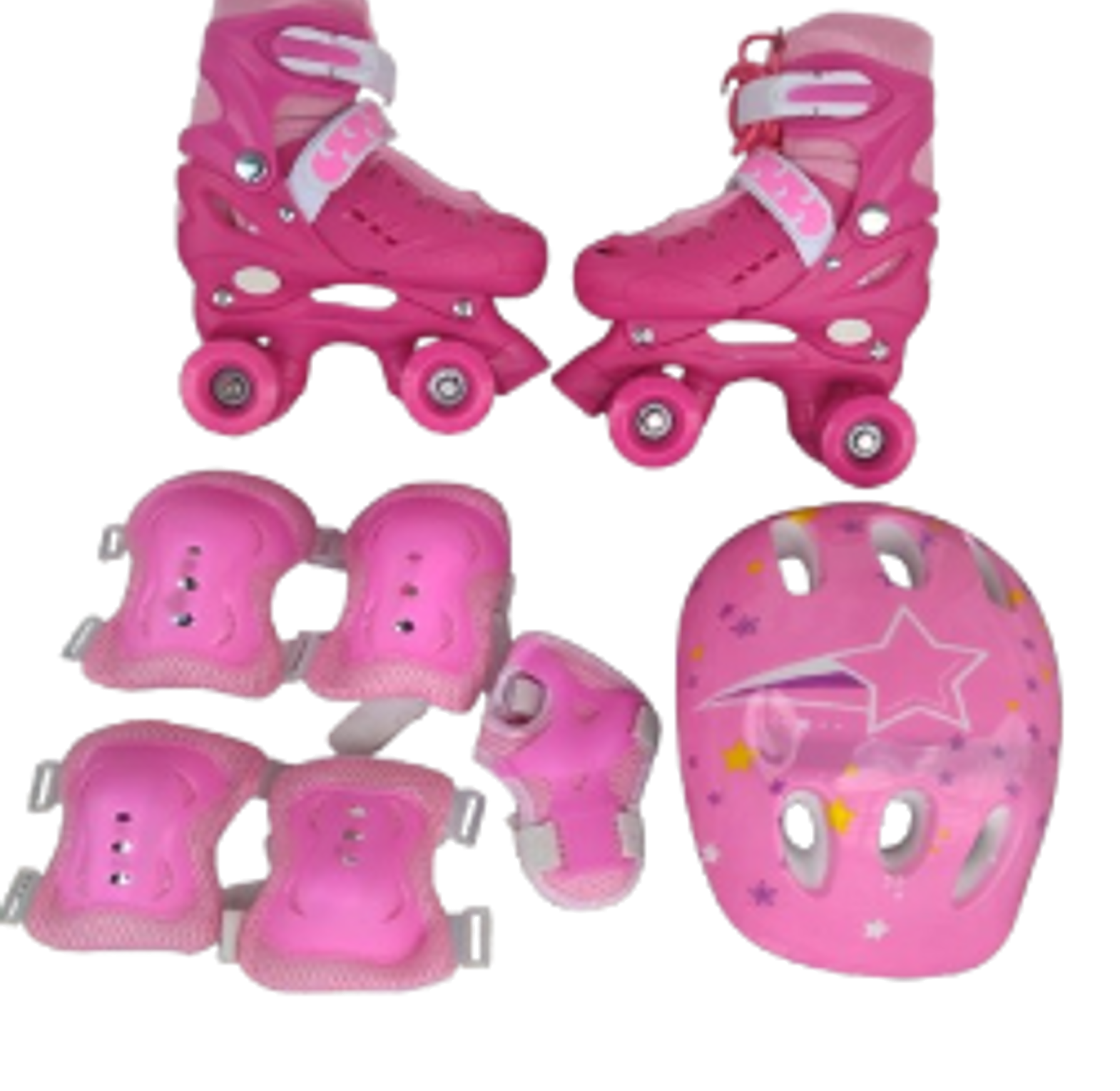 Quad Skates: The skates have four wheels arranged in two parallel rows for stability, which is suitable for beginners. The boots are pink with white straps and buckles for a secure fit. Protective Gear: The set comes with matching pink protective pads for the knees, elbows, and wrists to ensure safety while skating. Helmet: A pink helmet with a star pattern is included, providing head protection.