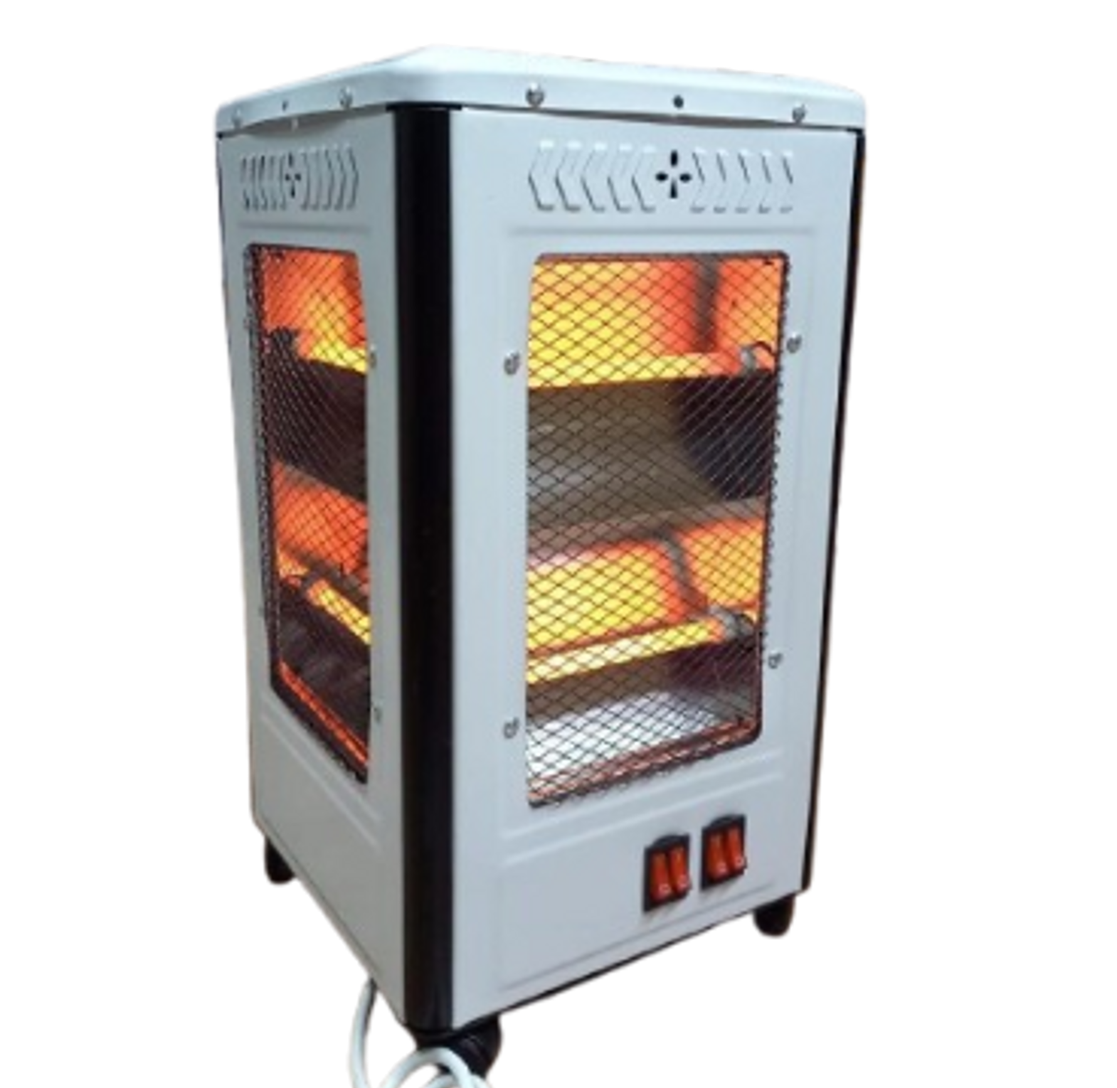 Type: Portable room heater, likely a halogen or radiant heater given the visible glowing elements. Design: Features a 4-sided design with visible heating elements behind a protective grate.