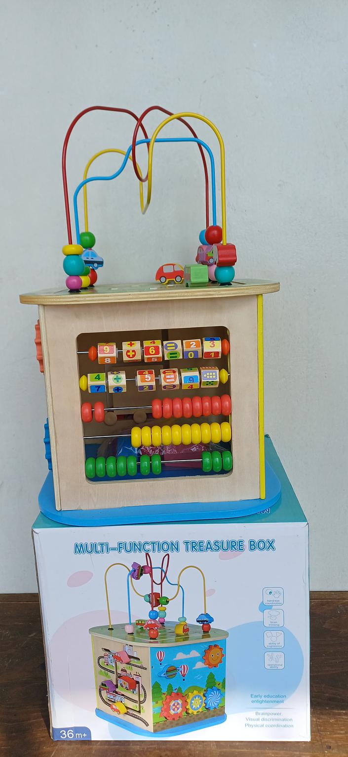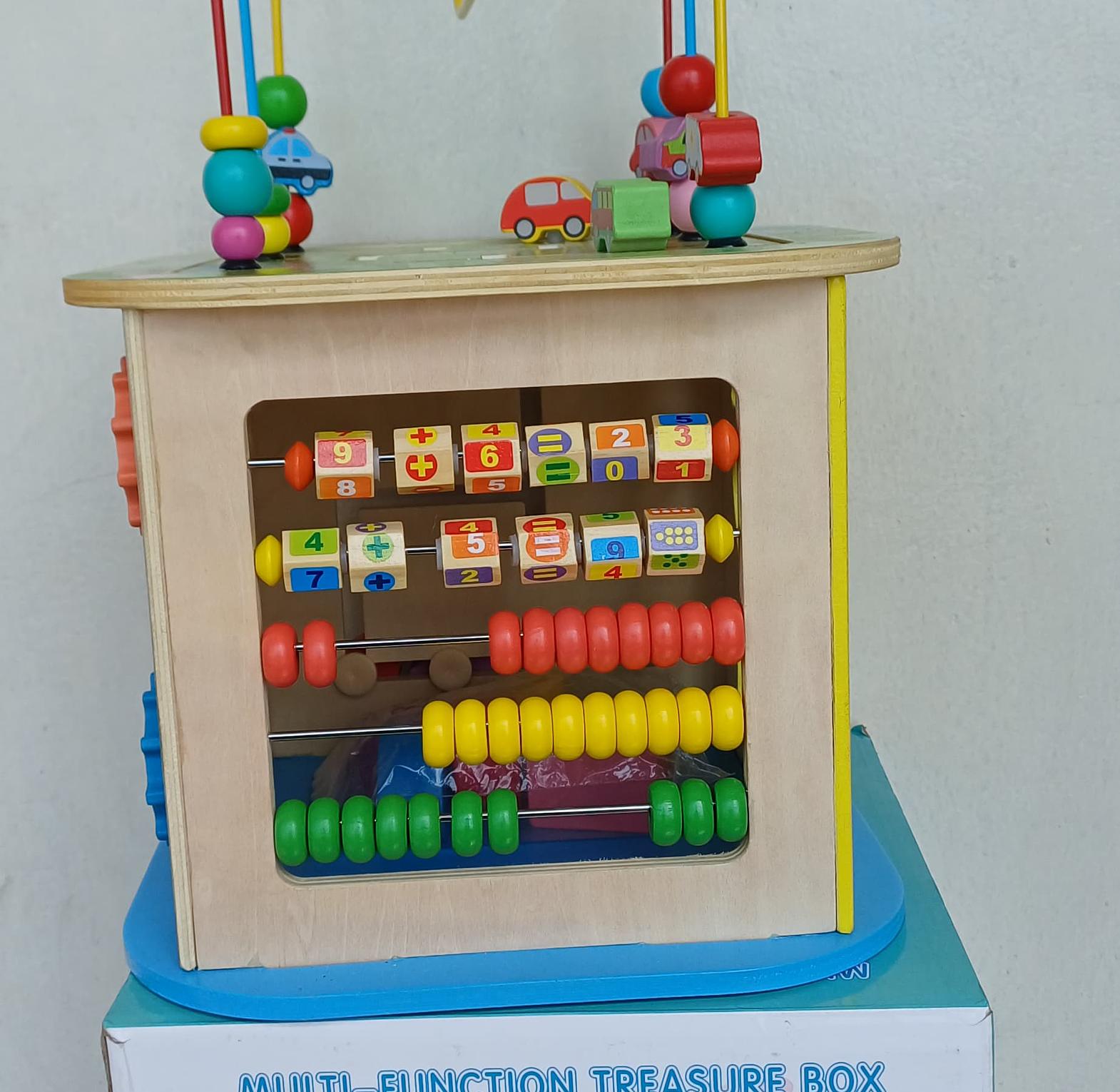 Wooden activity cube multi-sided educational toy for toddlers. It typically features several activities, such as a bead maze on top, an abacus, a clock, shape sorters, and turning gears. These toys are designed to help children develop fine motor skills, hand-eye coordination, and problem-solving abilities. The bead maze lid is often removable and can be inverted for easy storage.