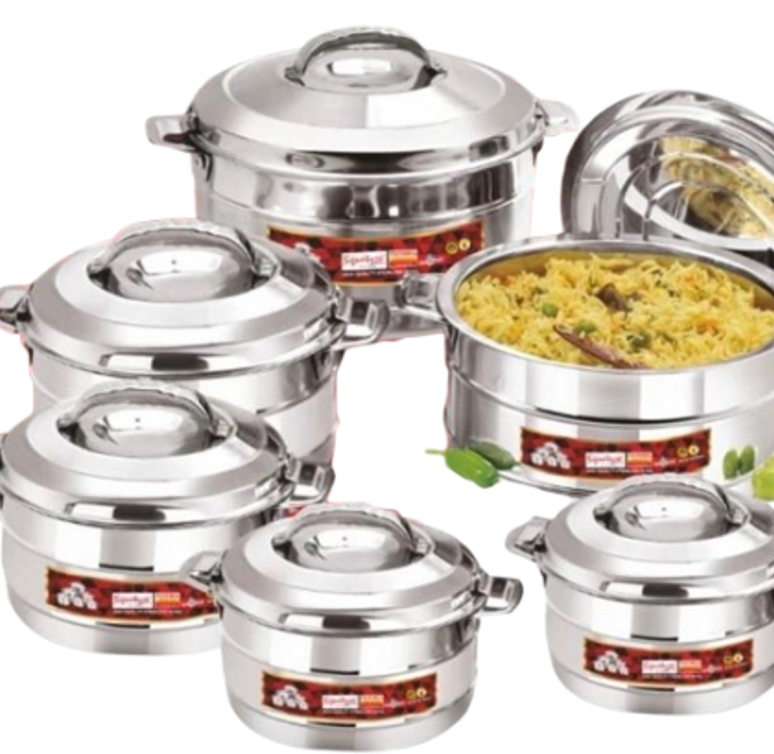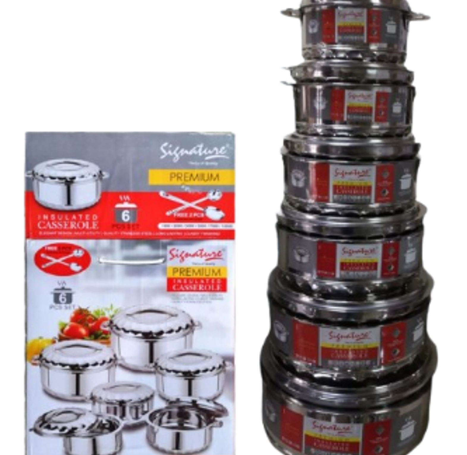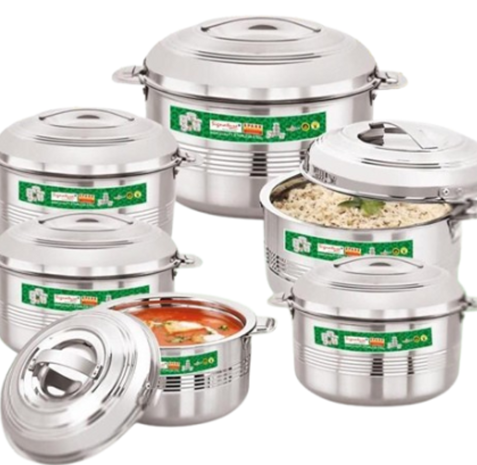 Keep your food hot and fresh for up to 6 Hours with this Elegant 6 Piece set Food Warmer Server/ Hot Pot. This double wall strong and sturdy Hot Pot is made of stainless steel and insulated with top quality material to keep your foods hot and cold for long. This set is ideal for luncheon, you can serve a whole party worth of food and snacks. Keeps food hot and fresh for up to 6 Hours Double wall strong and insulated. Ideal even for carrying during travel,picnics etc High Quality Stainless Steel. Make your order and have different taste of serving your meals.