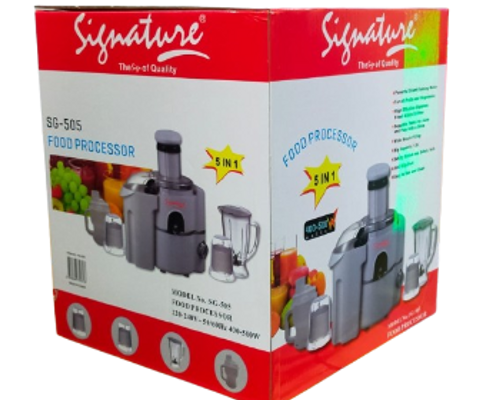 This SIGNATURE juice extractor extracts juice from citrus fruits, vegetables by shredding the flesh of the food item and any kinds of fruits such as Apples, Watermelon, Carrots, vegetables etc. It's great for making ice-cold smoothies or hot soups. To make things even easier and to help you save space in your kitchen. Both the bowl and the blender can be run from a single drive. Juice Extractor has 2 speeds for soft and hard fruit and vegetables.