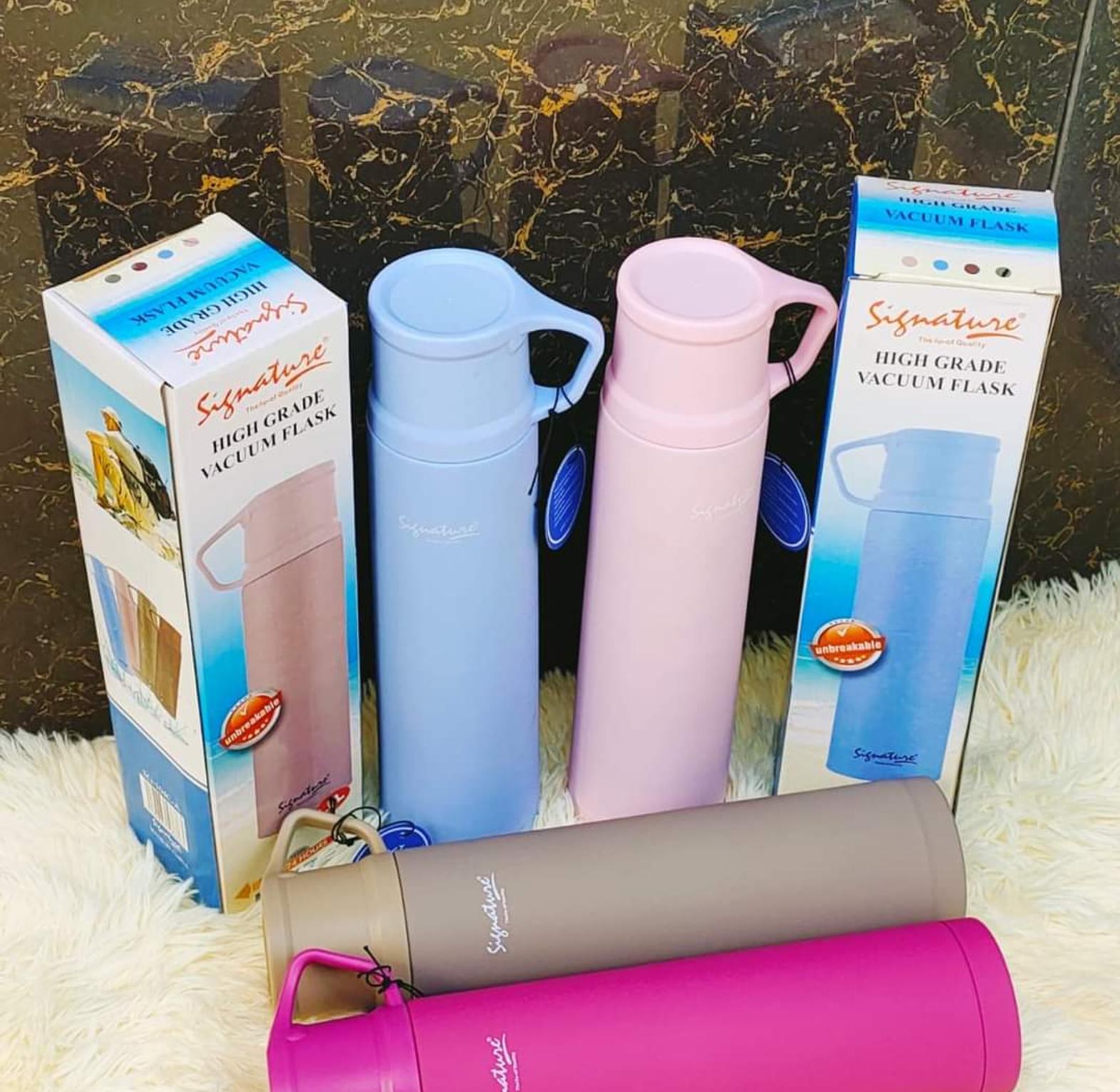 Name: Signature High Grade Vacuum Flask. Capacity: Available in 1L, Material: Made from high-quality stainless steel, featuring a double-wall construction and an unbreakable liner and case. Insulation: Vacuum insulated to effectively retain both hot and cold liquids for extended periods (e.g., hot for over 10 hours or above 65 degrees Celsius for 24 hours).