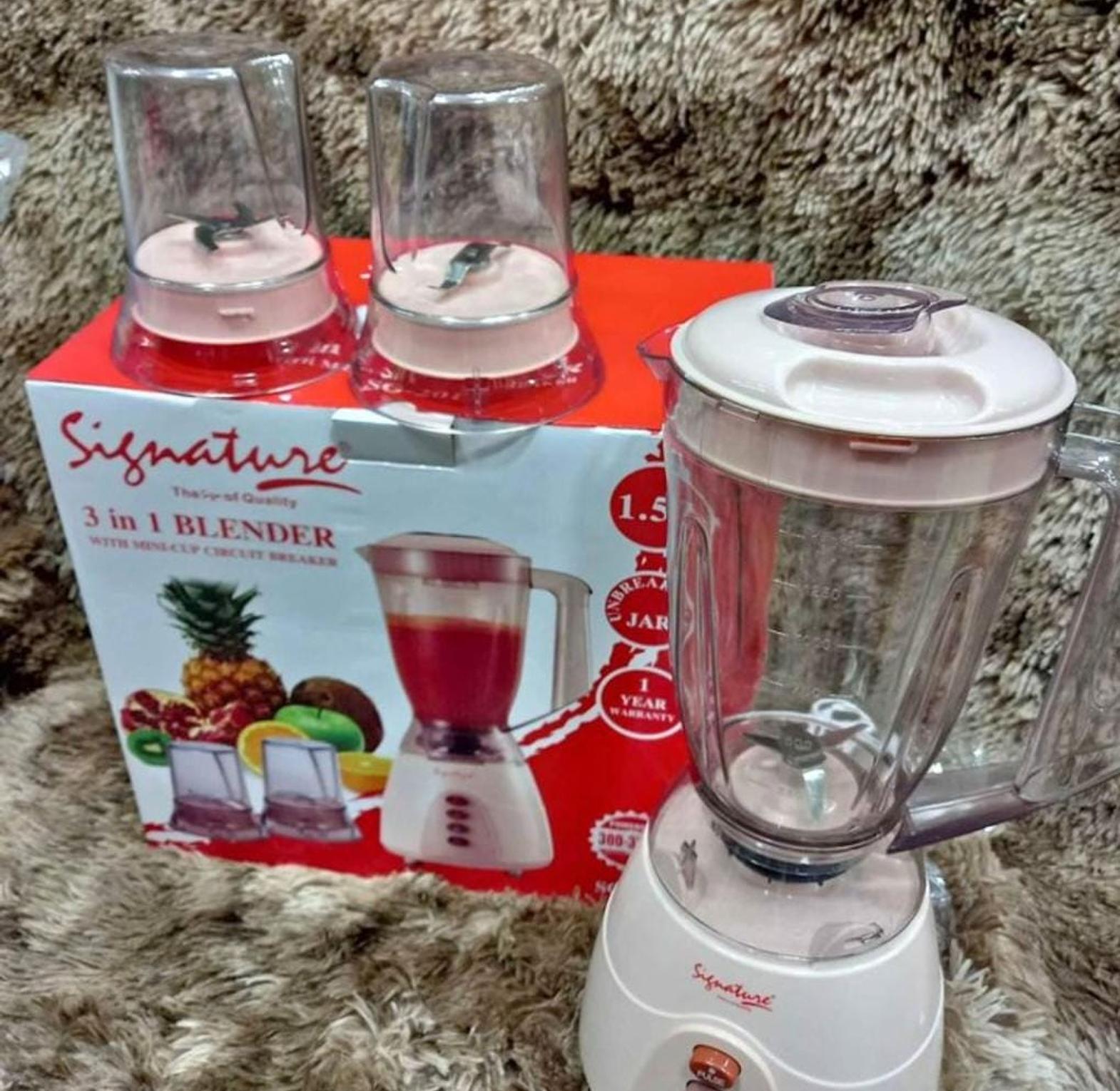 Signature 3 in1 blender is one among the most loved on in today modern kitchen for the best and most effective blending experience. It has strong blends that is hard to break and also consumes less power hence its power saving hence cut down the cost of power, its economical, the blends are easy to relave and adjustable to give you the desired blending. This is a quality blender for your home use and you will never be disappointed. you can start your journey of having great blending experience for your juices and making smoothies for babies. Mixer blender 3pcs Unbreakable jar 1.5 litre capacity Multi purpose. Soft design Stainless steel knife Safety device Simply place your order here today and have Vicmer Store deliver right at your doorstep.