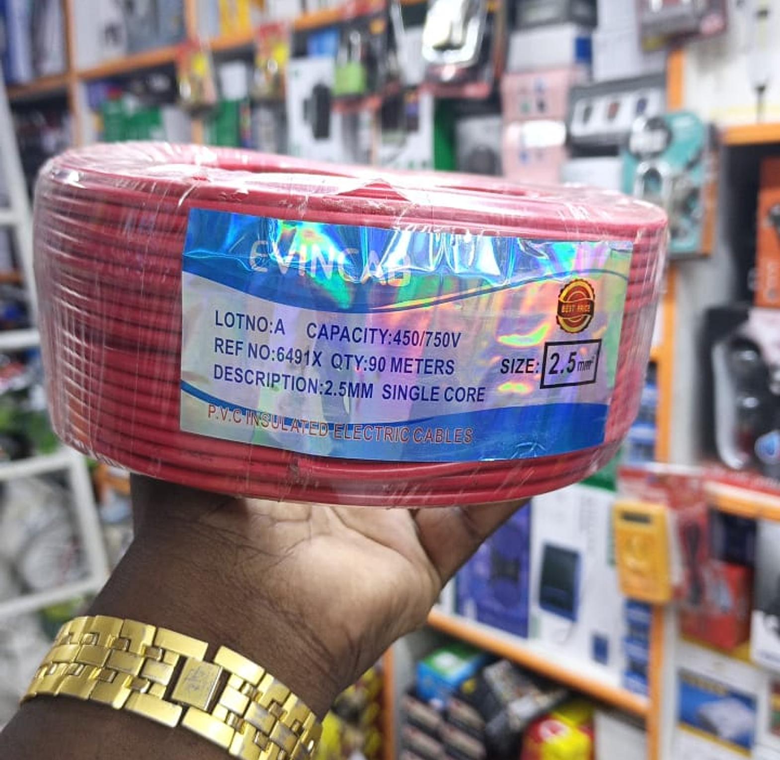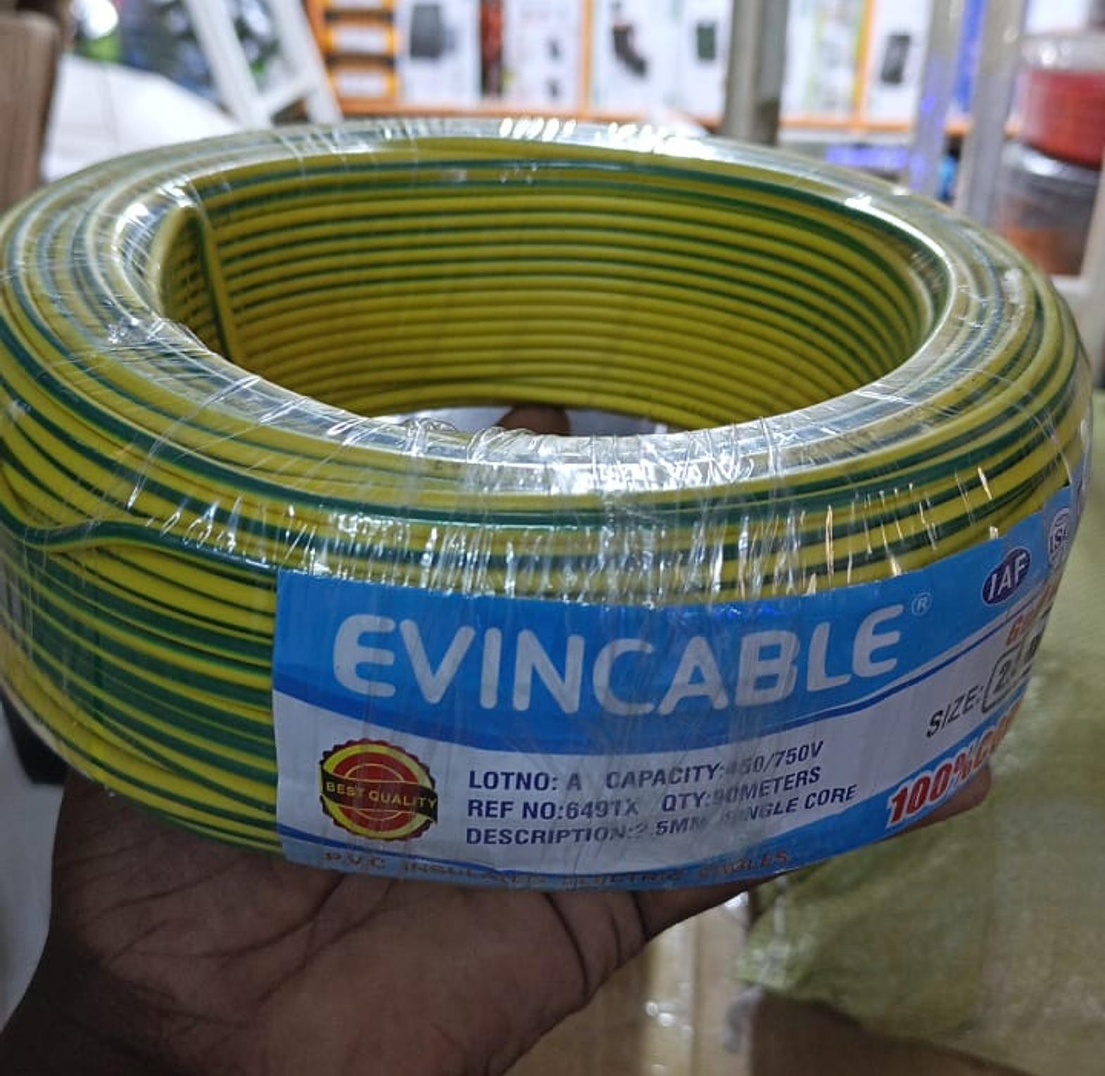 2.5m Single Core 2.5 MM SQ Voltage 450/750V 90M for Electrical Wiring Cablem Single core Cable Standard: BS 6004, KS 453. 2 Length=90 Meters Voltage rating: 450/750V (1mm 300/500V) When installed in an earthed metal enclosure, cables are suitable for voltages up to 1000V a.c(Alternate Current). or up to 750V to earth d.c.(Direct Current) Application: Industrial wiring. These cables are intended for drawing into trunking and conduit. They may also be used inside fixed, protected installations such as lighting fittings, appliances, switchgear and control gear Construction: Single core cable. Solid (Class 1) or stranded plain copper conductor (Class 2), PVC insulated only. Insulation colours: Black, Red and Green/Yellow. Other colours available on order. Maximum conductor temperature: 70°C Imported cable from China Suitable for Lighting wiring. Pure Copper Conductors,100% copper. Available in red, black and yellow/green colors.