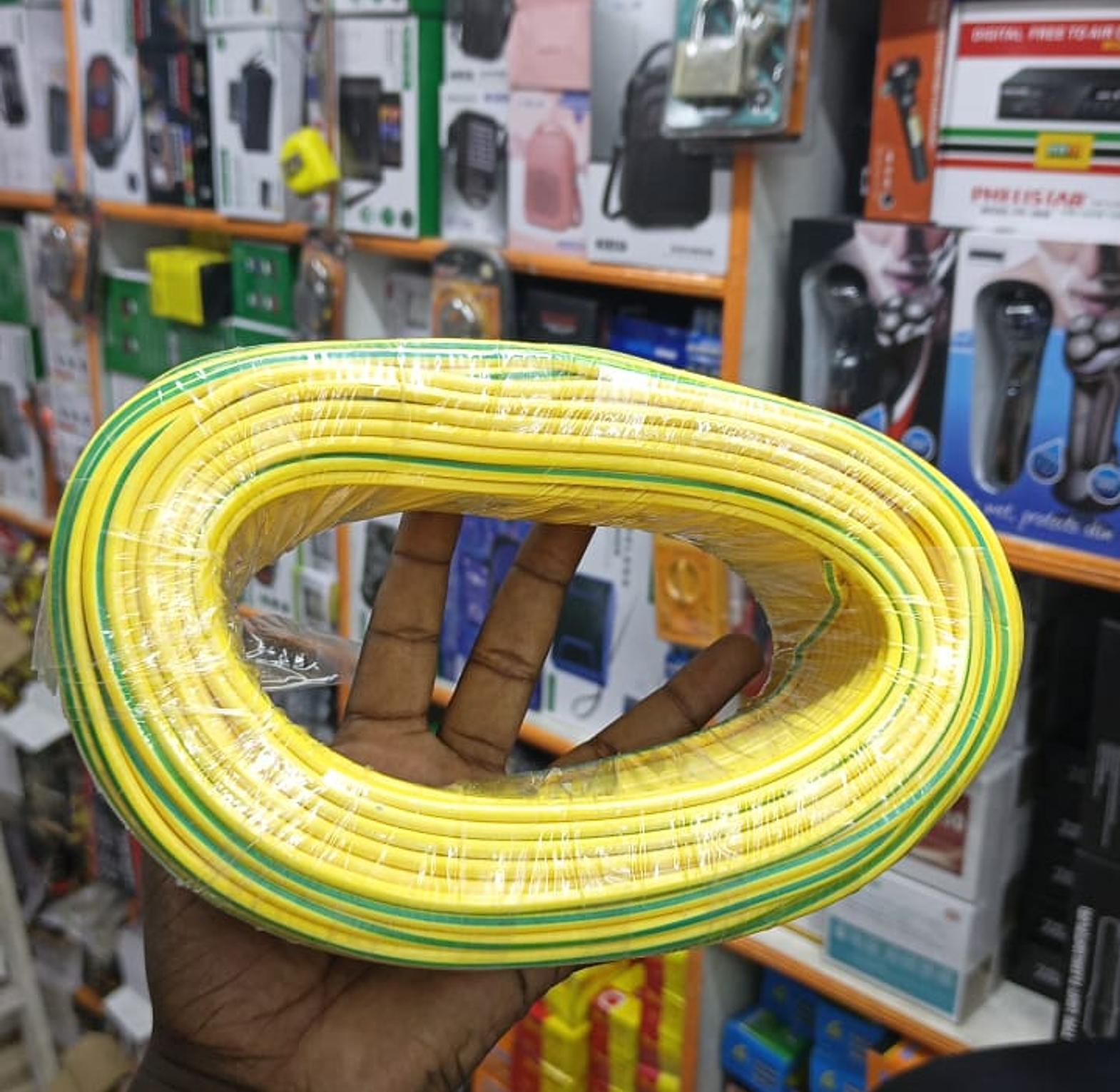2.5mm Yellow and Green Earth Cable (also known as Single Core Cable or Flexible Cable). Color: Yellow and green stripes, indicating its use as an earth or ground wire in electrical installations. Size: 2.5mm², referring to the cross-sectional area of the conductor, which determines its current-carrying capacity. Purpose: Primarily used for earthing or grounding electrical systems to provide a safe path for fault currents, preventing electric shock and protecting equipment. Material: Typically made with a copper conductor and PVC insulation