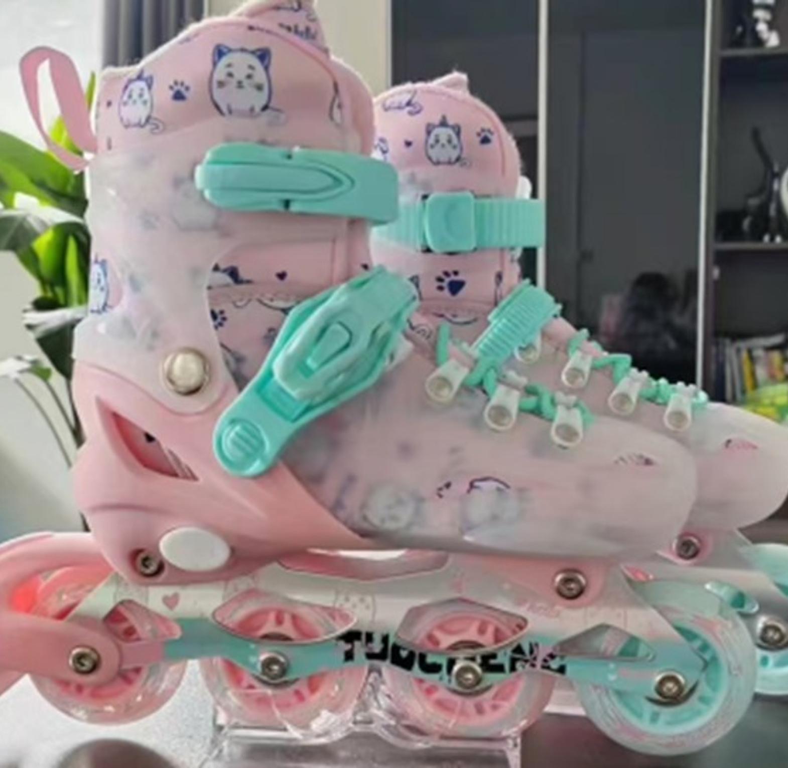 These are pink inline skates designed for children, featuring a hard boot for support and stability, and a soft, padded lining with a cat-themed pattern for comfort. They are typically adjustable in size to accommodate growing feet and feature buckle closures for a secure fit. The skates are equipped with inline skate wheels, often made of polyurethane, and may include flashing LED lights, particularly in models targeting beginners or younger children