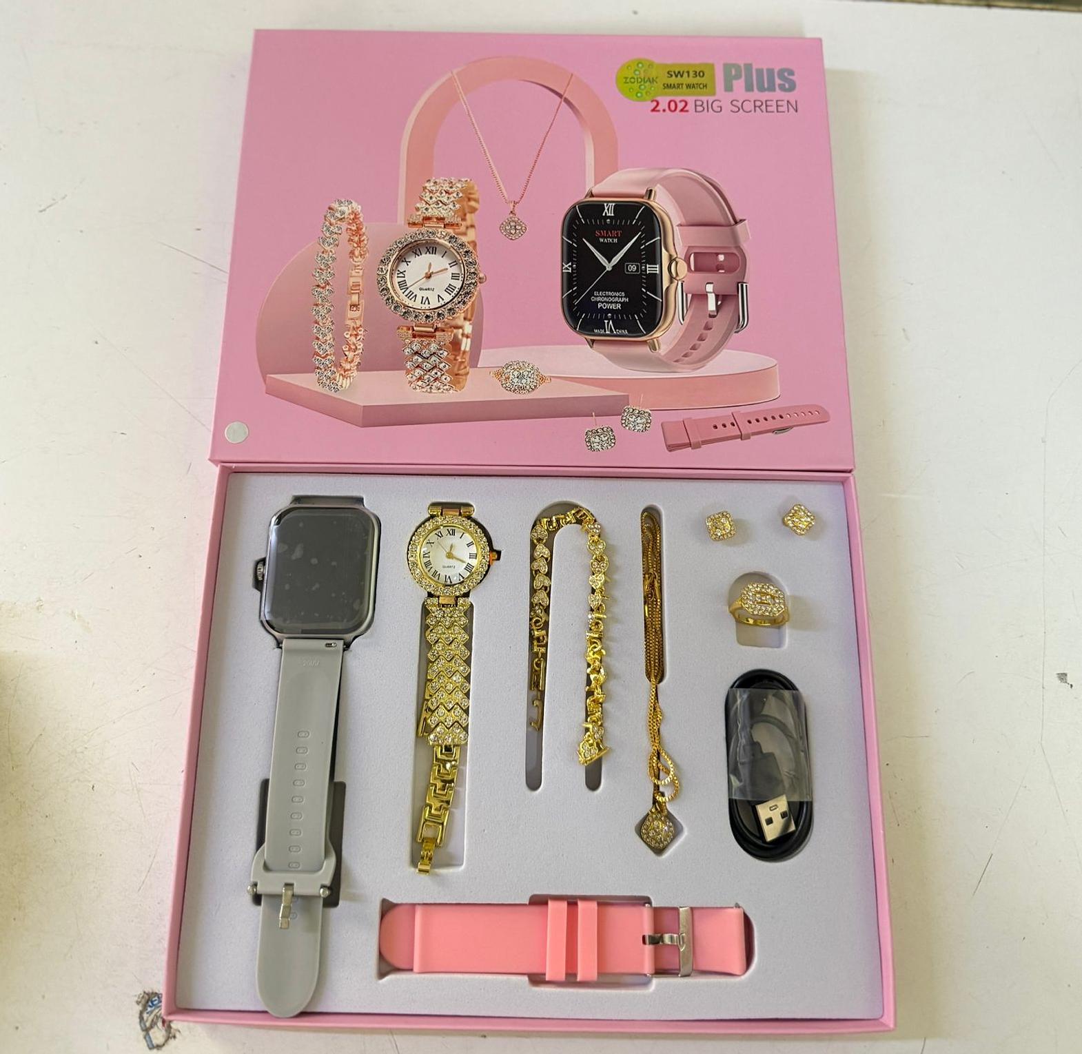 This is a luxury gift set for women that combines technology and fashion. It includes the A58 Plus Smartwatch, an analog watch, and various accessories like a necklace, earrings, bracelets (gold-tone and silver-tone), and a ring. The set is elegantly packaged in a stylish gift box. Receive SMS Calling and receive calls Heart Rate Monitor, Blood Oxygen Monitor, Sleep Monitor, Blood Pressure Monitor.