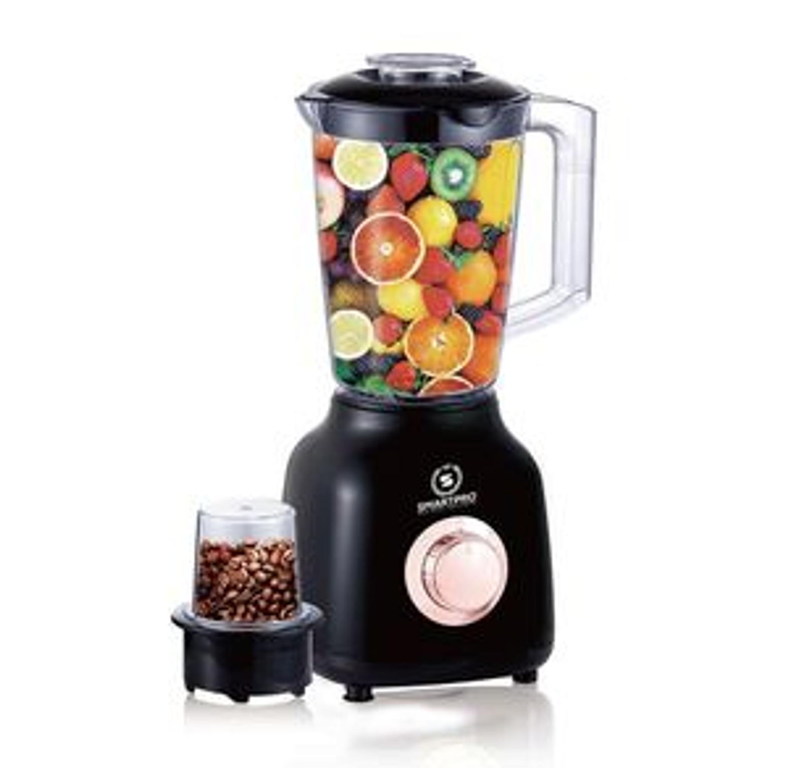 The Smartpro SBL-853B is a 2-in-1 countertop blender designed for various blending and grinding tasks. It features a durable, high-quality glass jar with a 1.5-liter capacity and comes with a separate grinding machine attachment