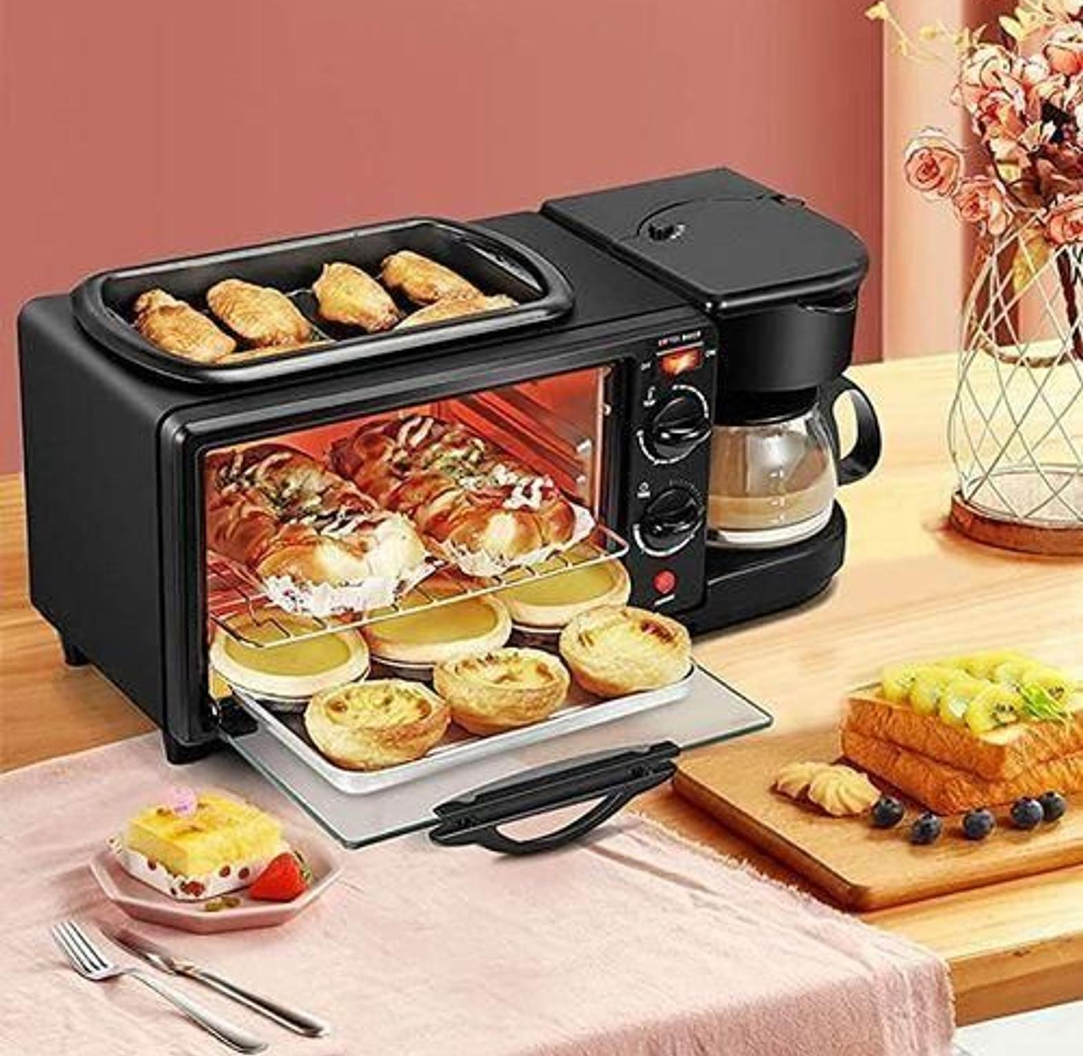 3-in-1 multifunction breakfast hub includes a removable oven tray and non-stick grill. Family-sized bakeware can be used in the morning to fry eggs, pancakes, sausages, bacon, potato pancakes, etc. This multifunctional breakfast station covers your entire morning breakfast, allowing you to make coffee, toast and eggs at once, saving you time and space on the counter. Can be used for cakes, buns, grilled sausages, steaks, etc. The right side can make coffee, hot water, dissolve milk powder, etc. Circulating heat flow, constant temperature baking double tube heat balance, turn on the oven function, the upper and lower baking tubes heat at the same time, forming a circulating heat flow, and three-dimensional food baking is more delicious! This breakfast machine 3 in 1 combines the three functions of a toaster oven, a coffee machine and a baking tray, allowing you to cook coffee, grill sausages, fried eggs, etc. while making breakfast in the morning. Coffee Machine: This coffee maker can brew up to 4 cups of coffee at a time in a few minutes, which can be prepared for your family. Let you spend the least time in the morning and enjoy a nutritious breakfast