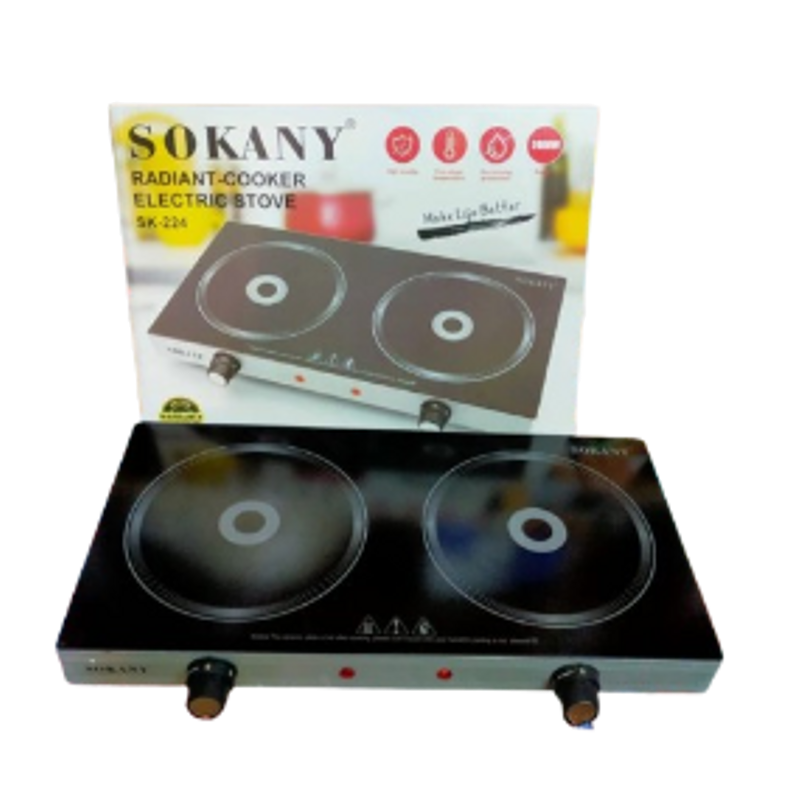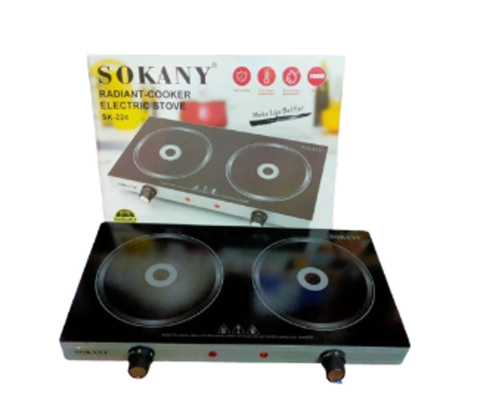 This is a double-plate electric stove with a radiant cooker design. It is described as a high-quality, energy-efficient home appliance that is both comfortable and practical for cooking at home or outdoors. It features a glass ceramic surface and is designed with safety in mind, including an indicator to prevent accidental contact when hot