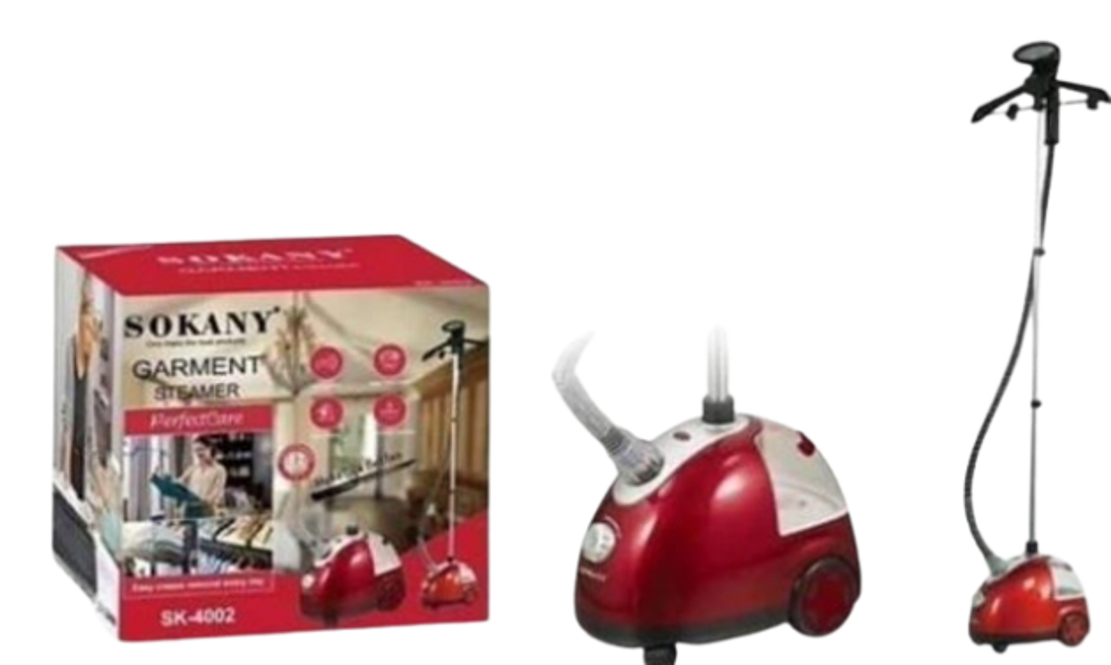 Sokany SK-4002, a floor-standing vertical garment steamer designed for efficient wrinkle removal without the need for an ironing board. The Sokany SK-4002 is a high-performance steamer that uses high-temperature steam to smooth, freshen, and sanitize garments. It is suitable for a wide range of fabrics, including cotton, silk, wool, and polyester, as well as household items like curtains and upholstery. Its upright design features a telescopic pole and a rotating hanger, allowing users to easily access every part of a garment