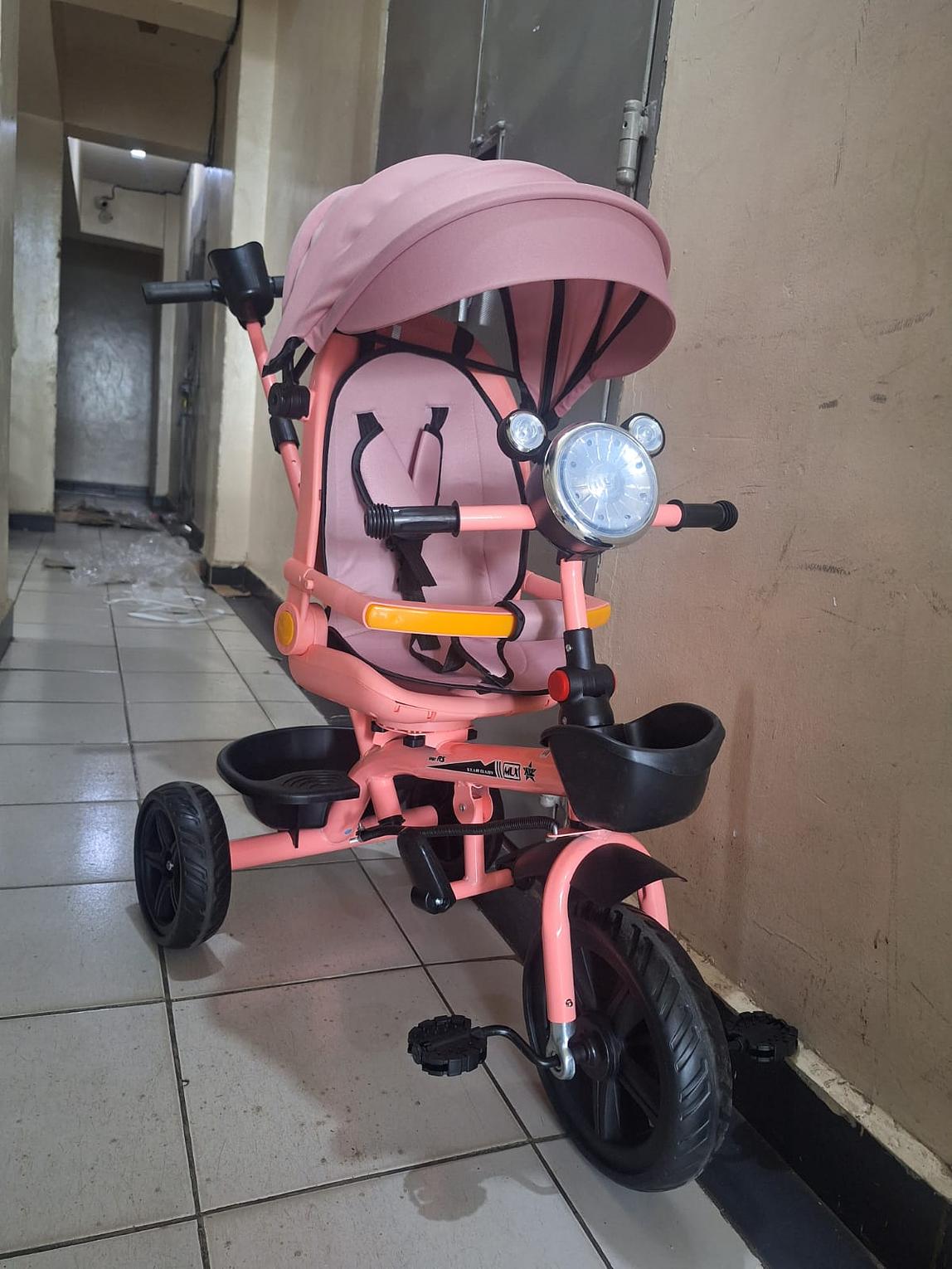 This type of product is designed to grow with a child, transitioning from a parent-controlled stroller for toddlers to a pedal-powered tricycle for older children. The model shown is pink, has a canopy, a parent push handle, and various safety features.