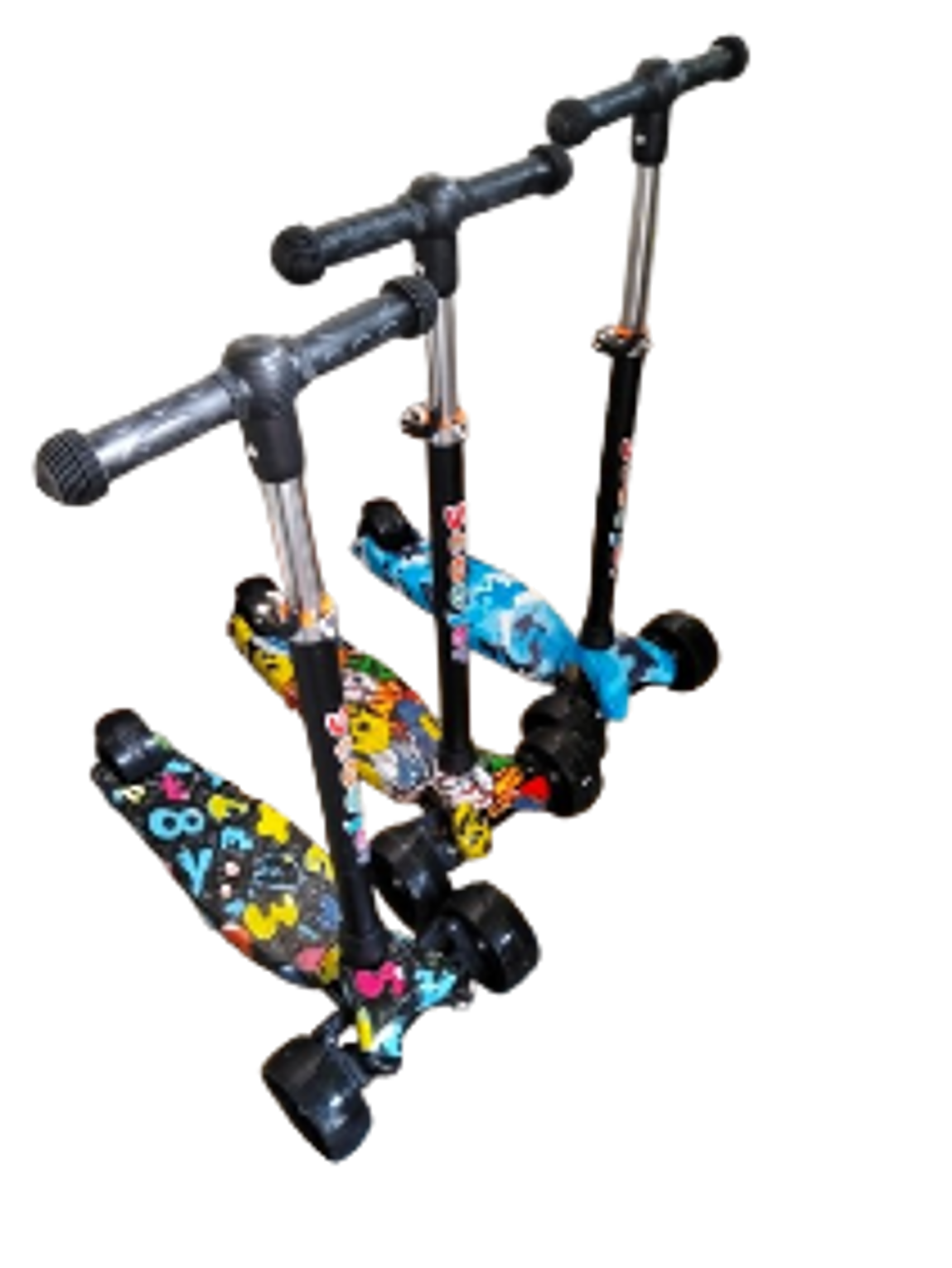 Design: The scooters feature a colorful, graffiti-style deck and are designed with three wheels for stability. Handlebar: The handlebar is typically adjustable in height, allowing the scooter to grow with the child. It often has a sawtooth thickening design for a non-slip, comfortable, and shock-absorbing grip.