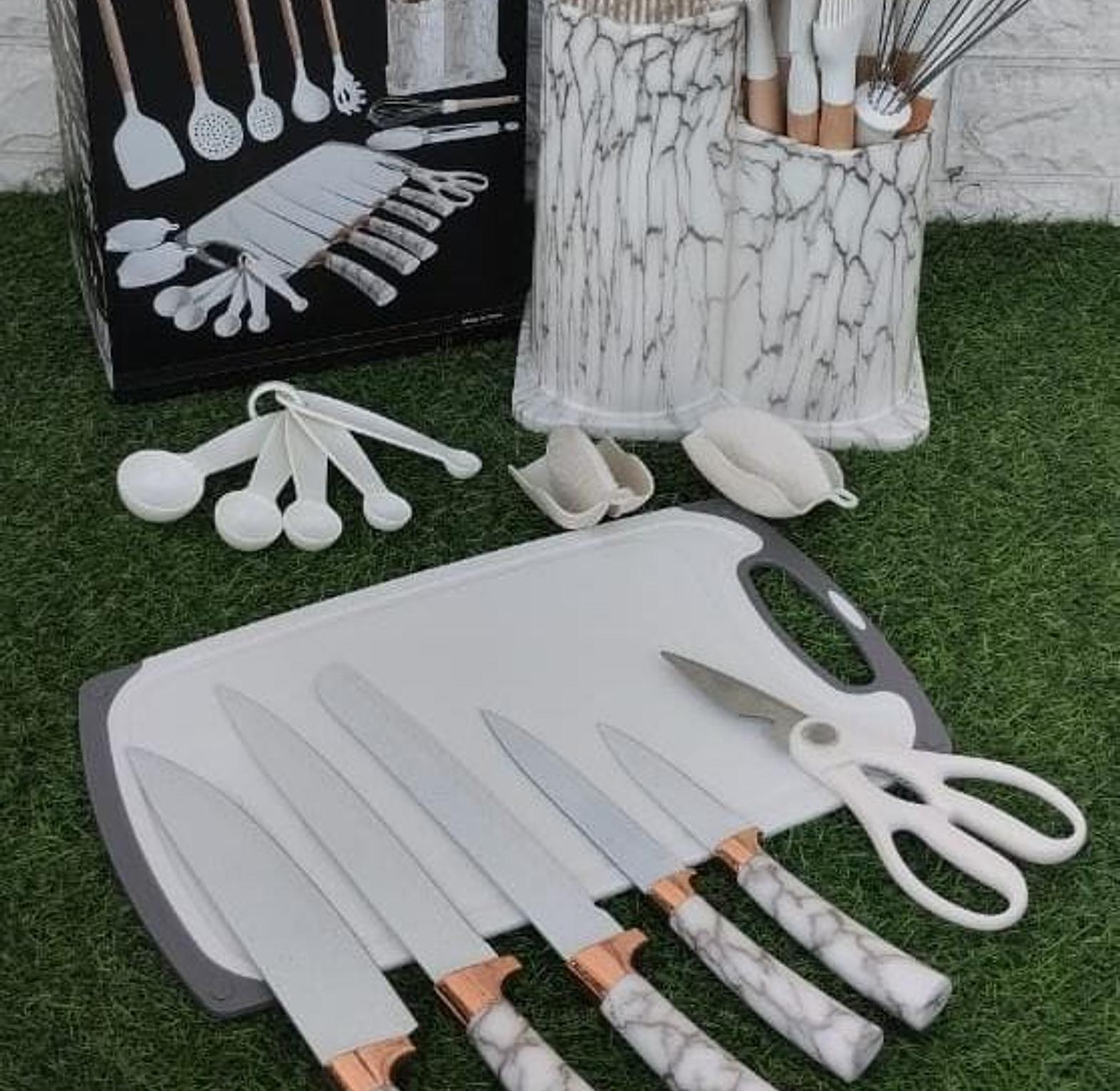 25-piece silicone spoon set with marble design, heat resistant, non-stick, and safe for all cookware.