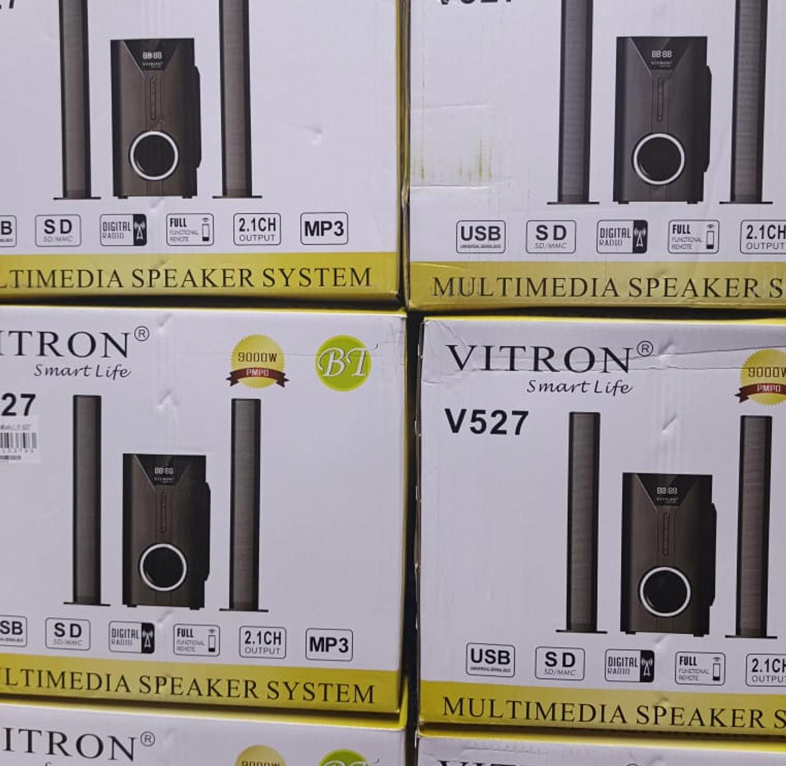 Name: VITRON V527 Multimedia Speaker System. Channels: 2.1 Channel. Power Output: 9000W PMPO (Peak Music Power Output).