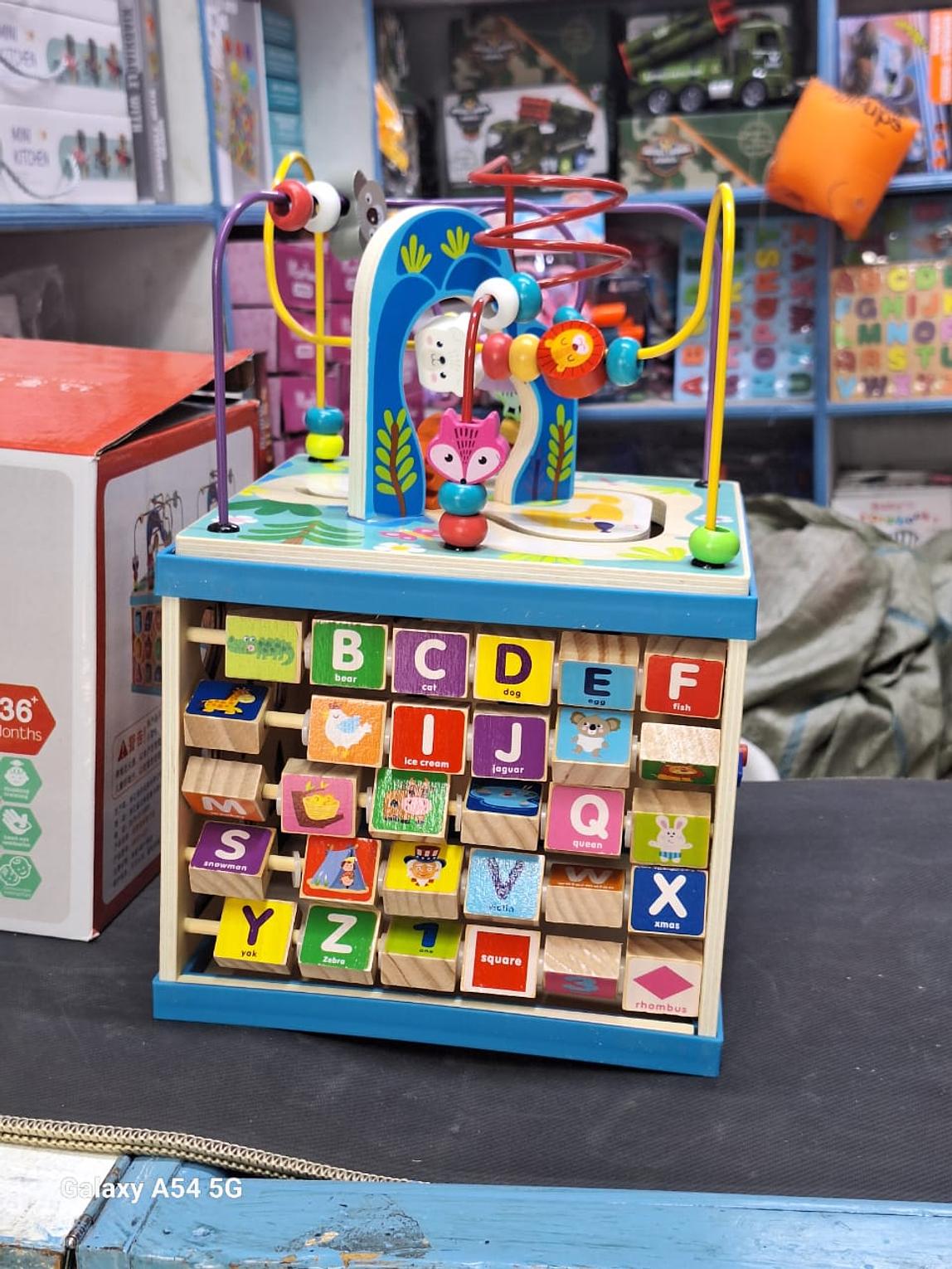 It is designed as a space-saving educational tool that integrates several developmental games into a single, compact unit